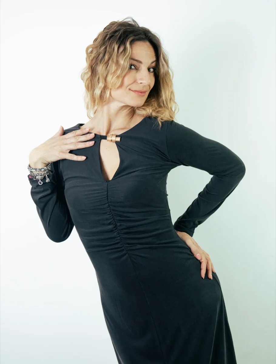 Abito dalla silhouette raffinata e avvolgente, realizzato in tessuto elasticizzato che garantisce comfort e libertร di movimento. Il dettaglio dorato nel dรฉcolletรฉ aggiunge un tocco di sofisticatezza e luminositร , perfetto per valorizzare le vostre curve. La vestibilitร aderente esalta le forme femminili, mentre la freschezza del tessuto lo rende ideale per indossarlo tutto il giorno. […]