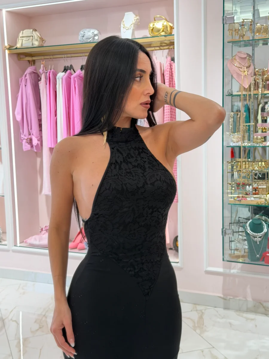 Abito in licra con ricami e spacco. Elasticizzato