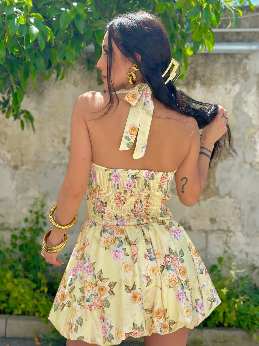 Abito Palloncino con coppe interne, stampa fiori, tessuto elasticizzato
