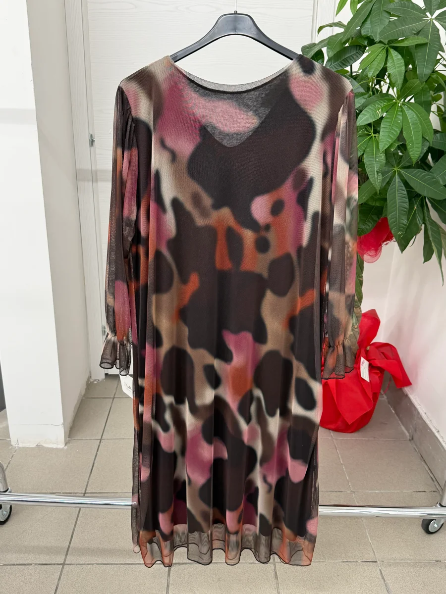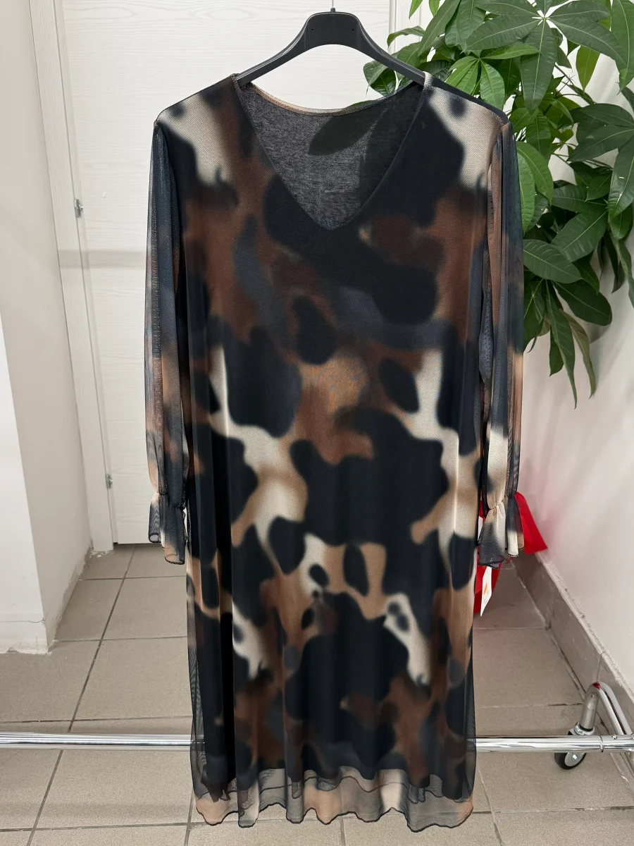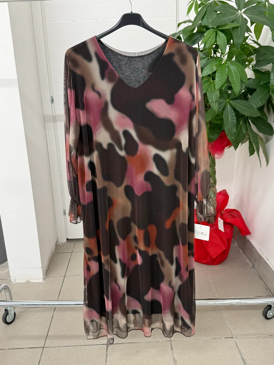 Abito lungo a fantasia con scollo a V con maniche semitrasparenti