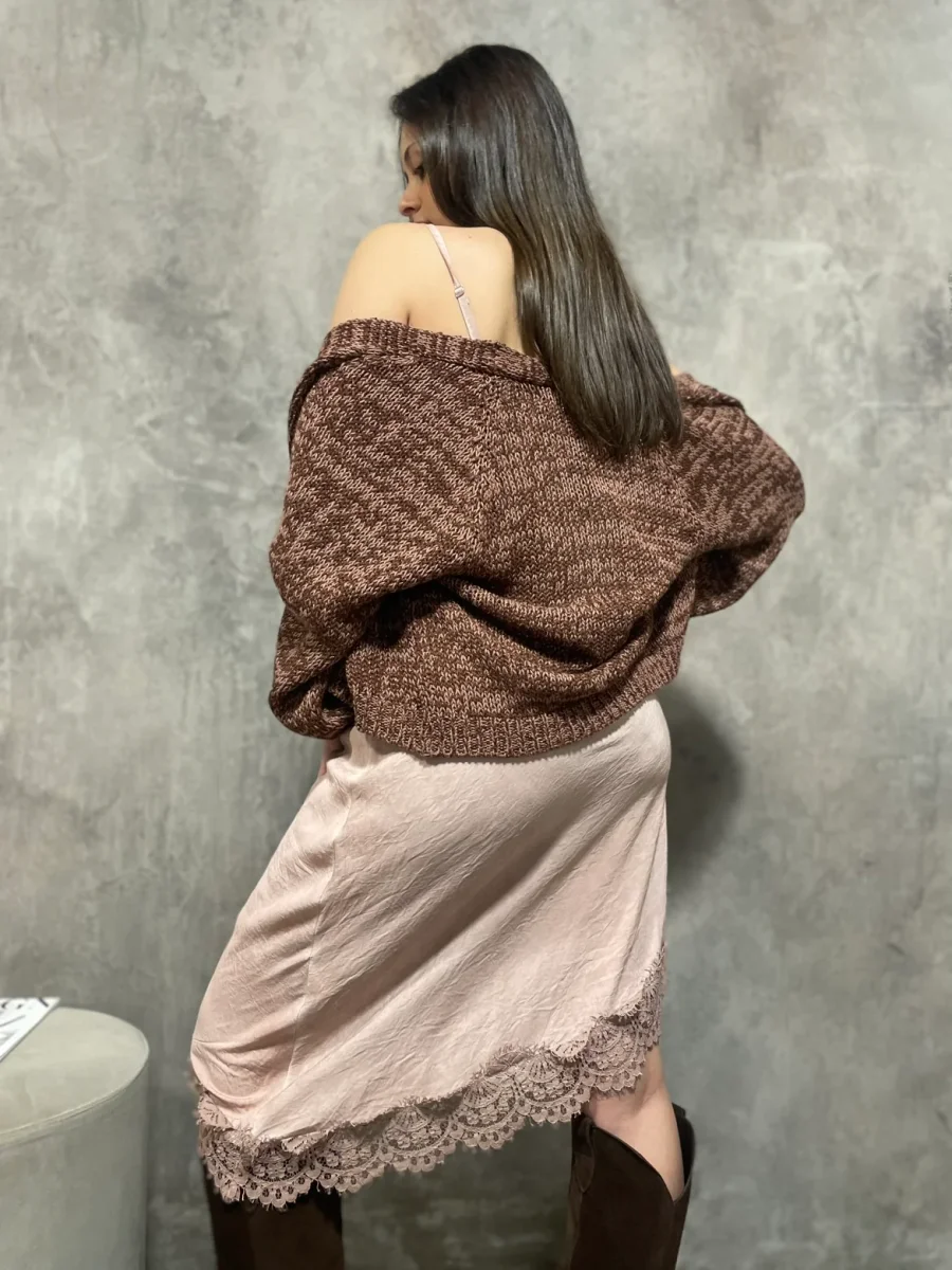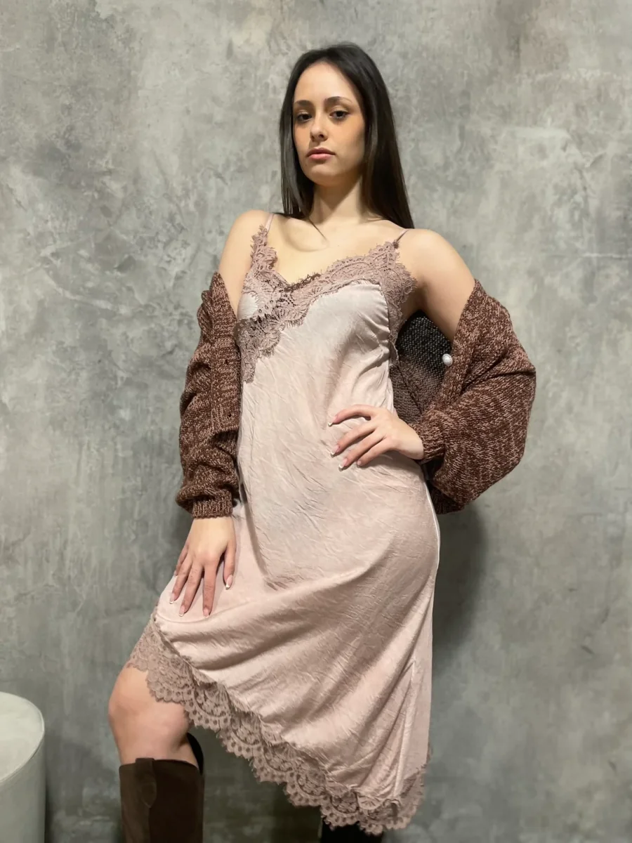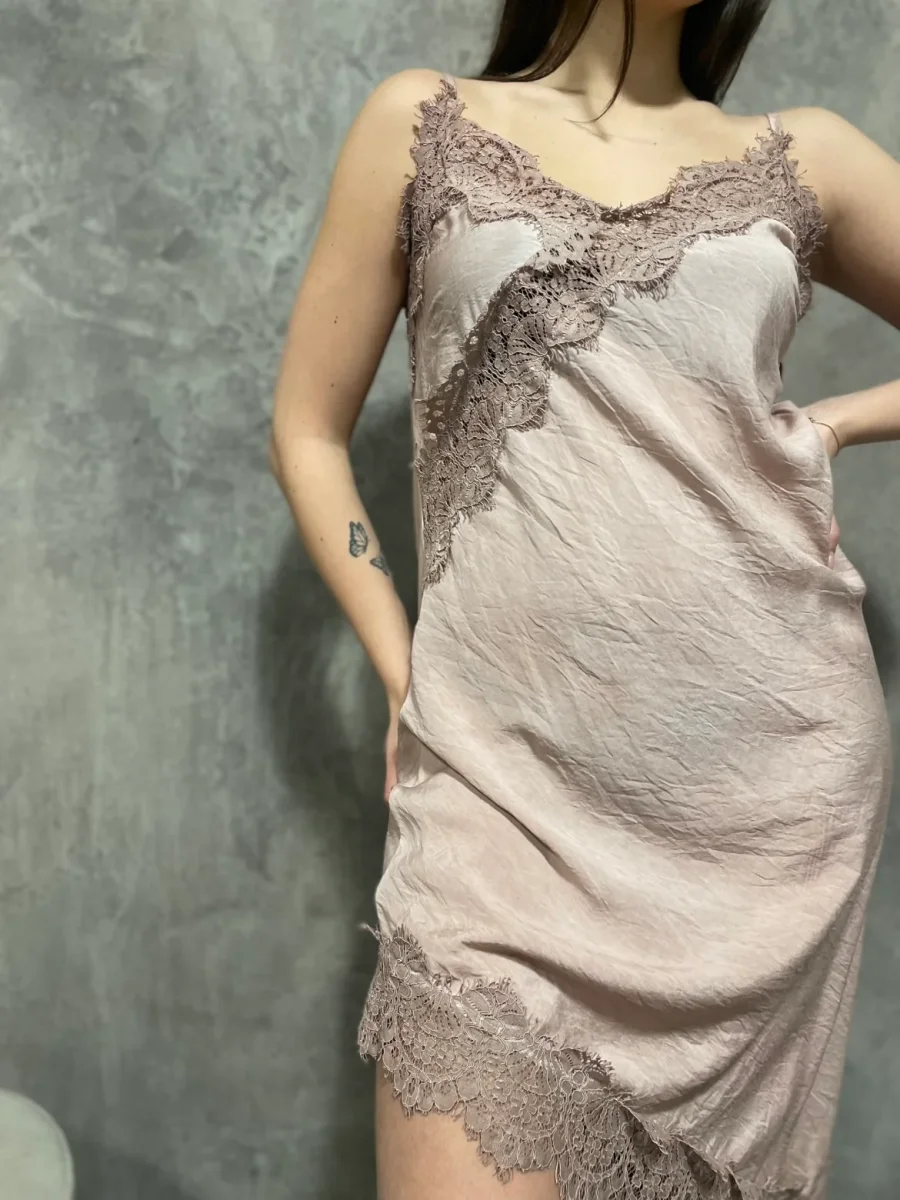 Abito sottoveste con pizzo tono su tono sullo scollo e sul fondo, spalline regolabili.