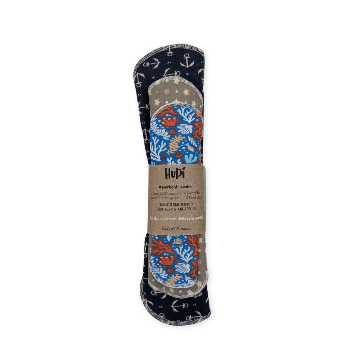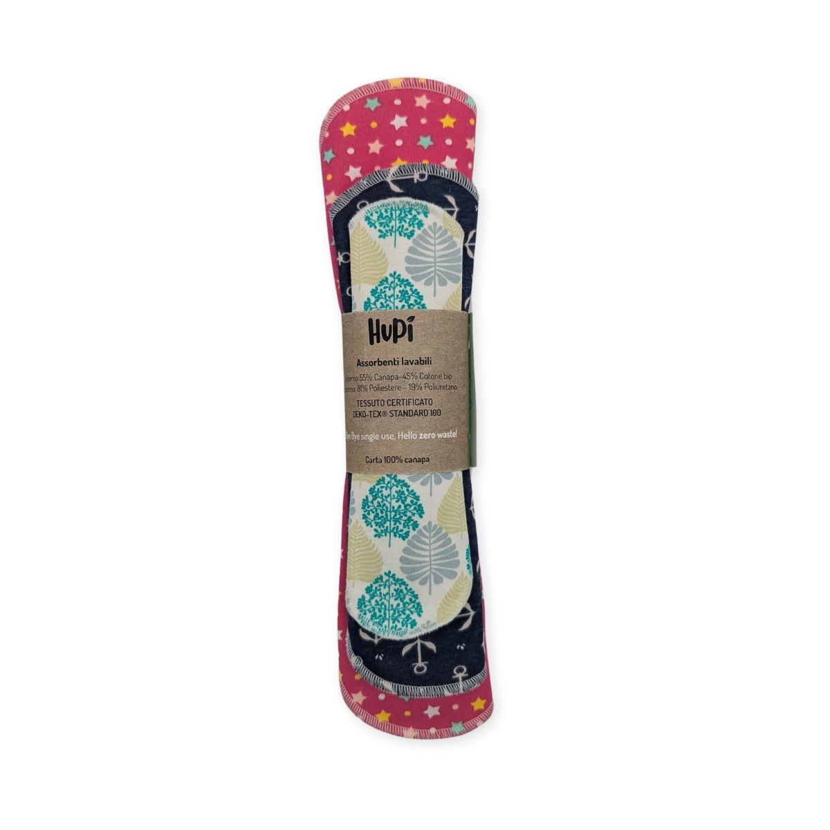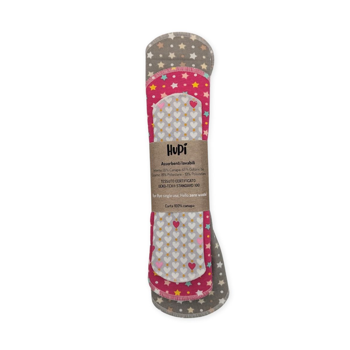 Per fare un paragone rispetto ai normali usa e getta puoi considerare il doppio dell’assorbenza. Quindi se solitamente cambi l’assorbente ogni 3 ore, potrai tenere l’assorbente Hupi per almeno 5-6 ore.