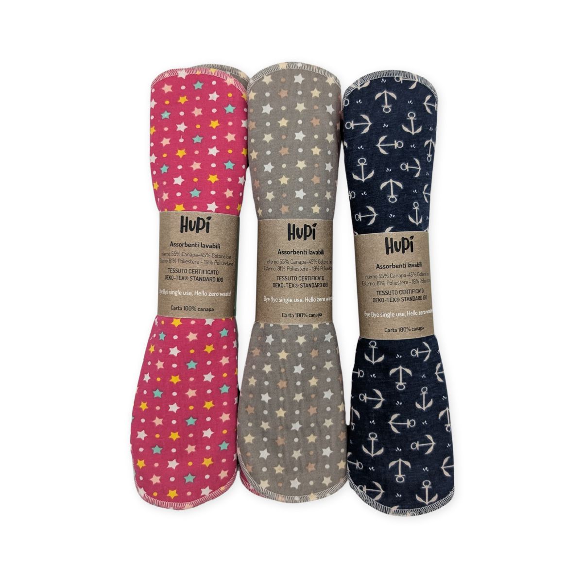 Per fare un paragone rispetto ai normali usa e getta puoi considerare il doppio dell’assorbenza. Quindi se solitamente cambi l’assorbente ogni 3 ore, potrai tenere l’assorbente Hupi per almeno 5-6 ore.