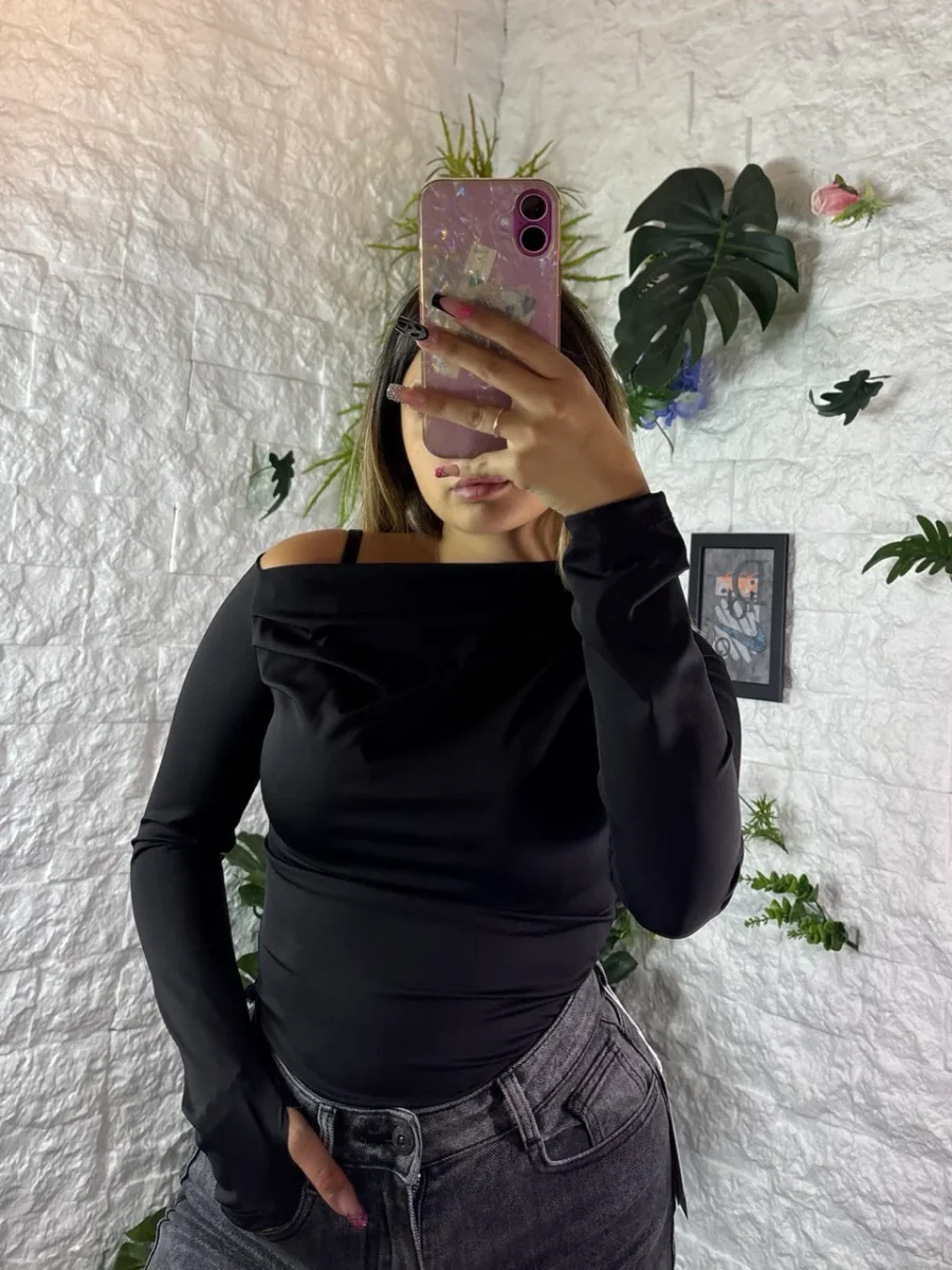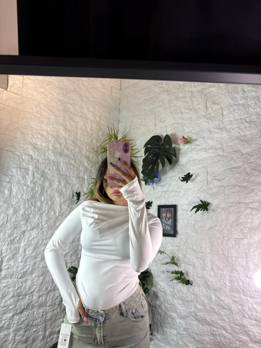 Body aderente con scollo morbido monospalla e maniche lunghe a guanto.