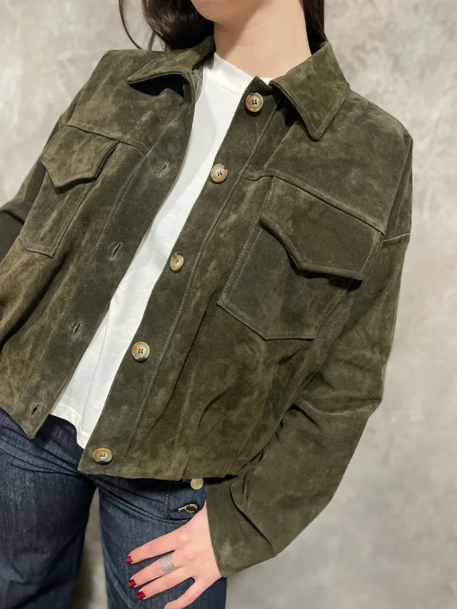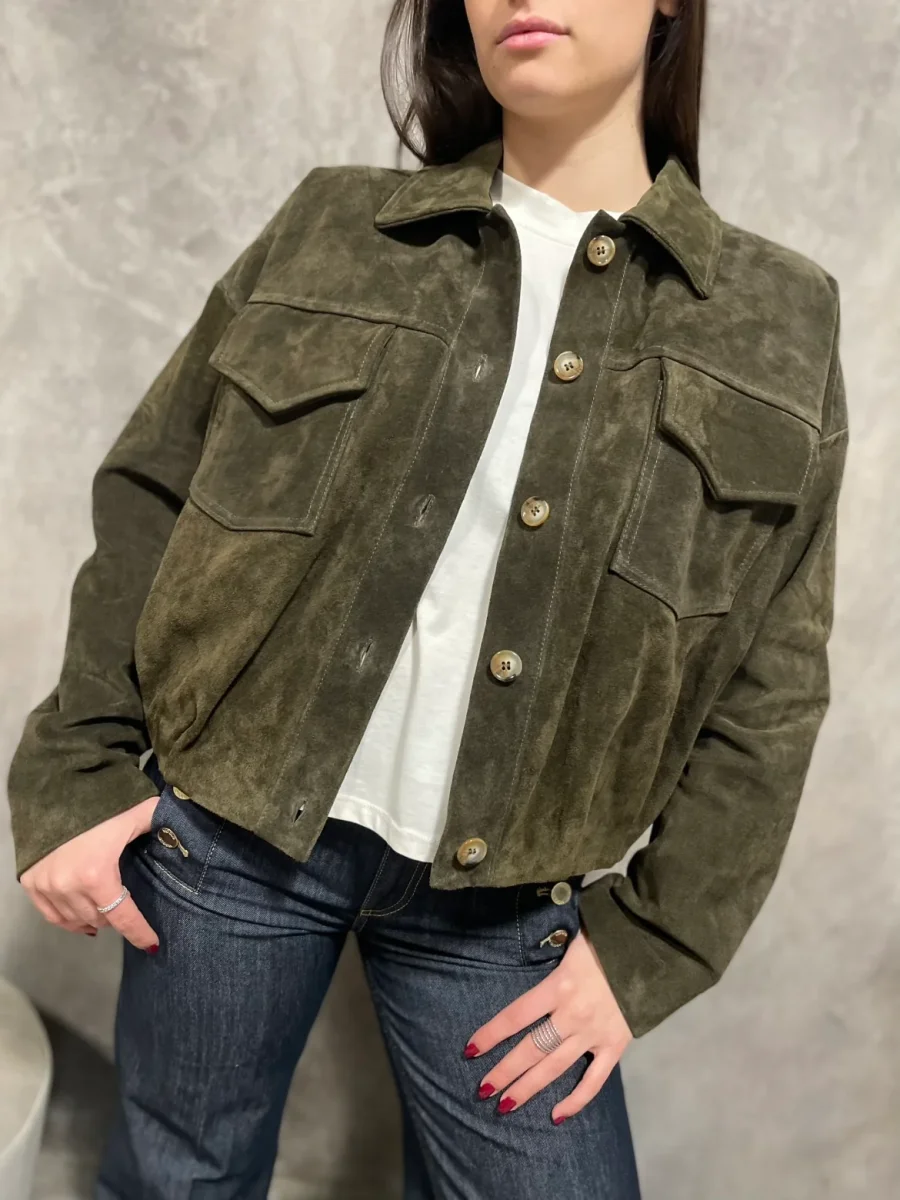 Giacca modello bomber in vera pelle di camoscio, chiusura con bottoni tasche frontali. Composizione: 100% Vera Pelle.