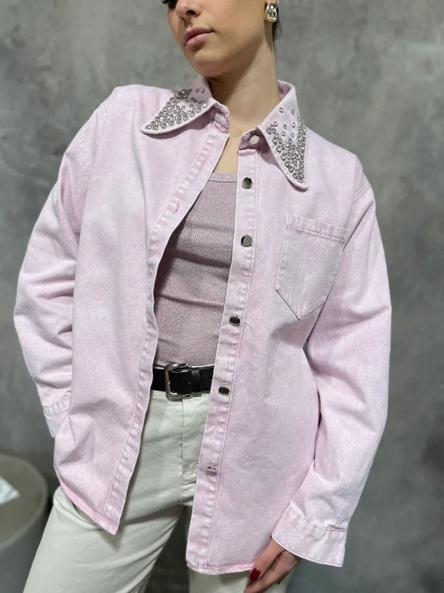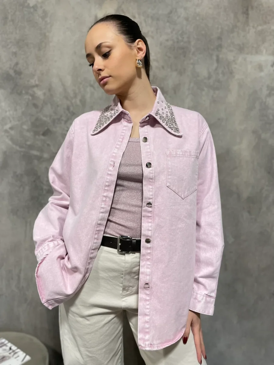 Camicia in denim colore rosa, con strass sul collo. Taglia Unica. Tela Jeans: 100% Cotone.
