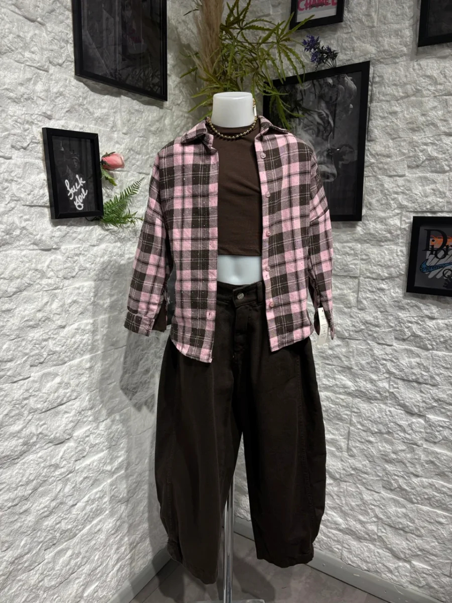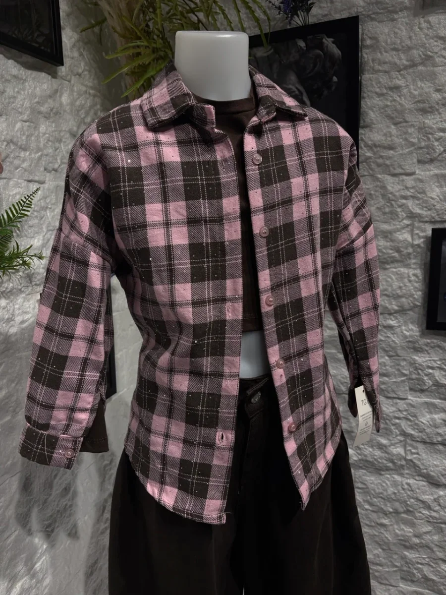 Camicia a quadri rosa e marrone con colletto classico e chiusura a bottoni frontali. Il motivo check la rende vivace ma facile da abbinare nei look quotidiani.