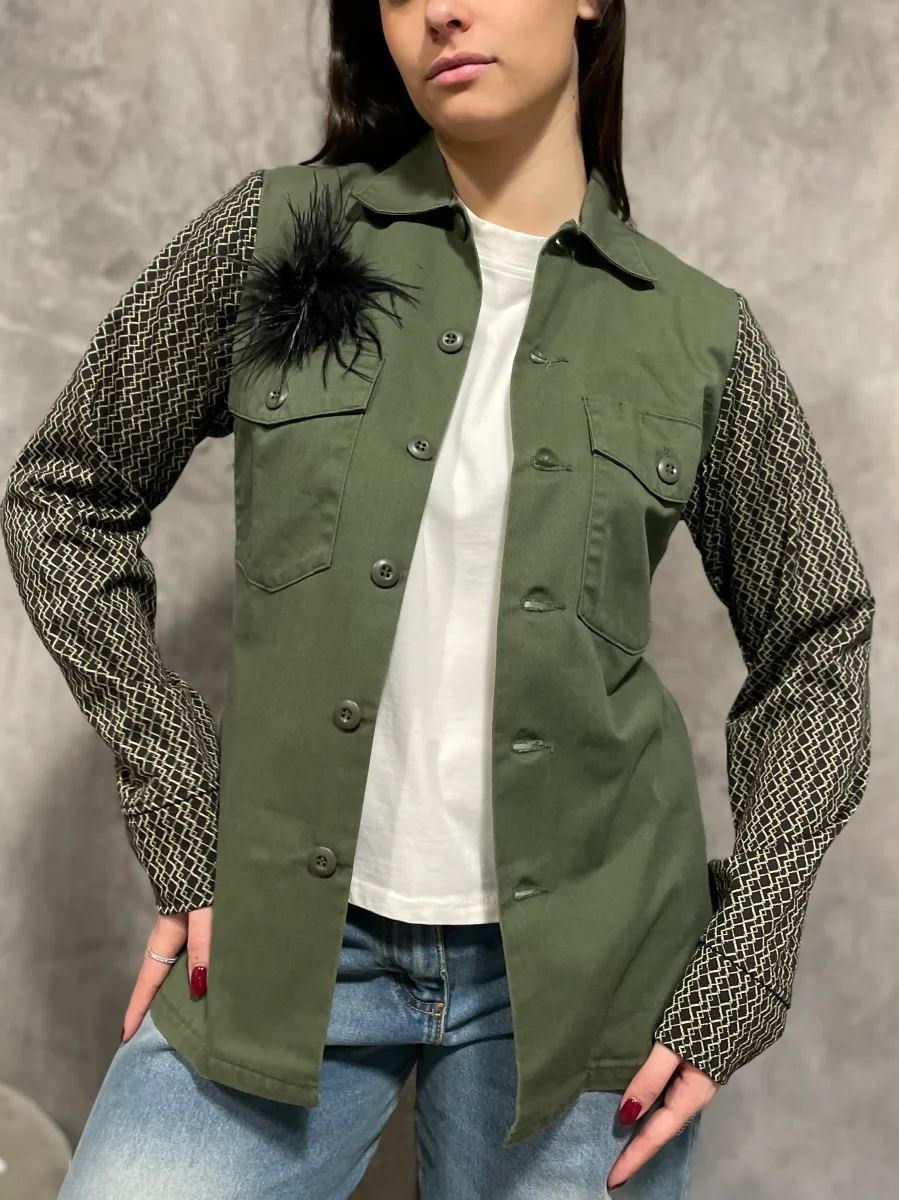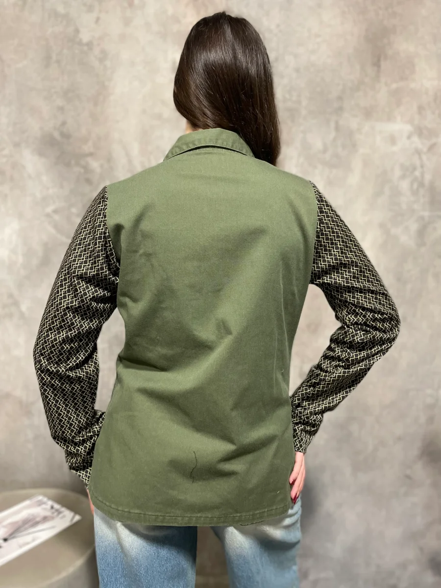 Camicia vintage colore verde con maniche in tessuto, spilla sul petto rimovibile. Taglia Unica.