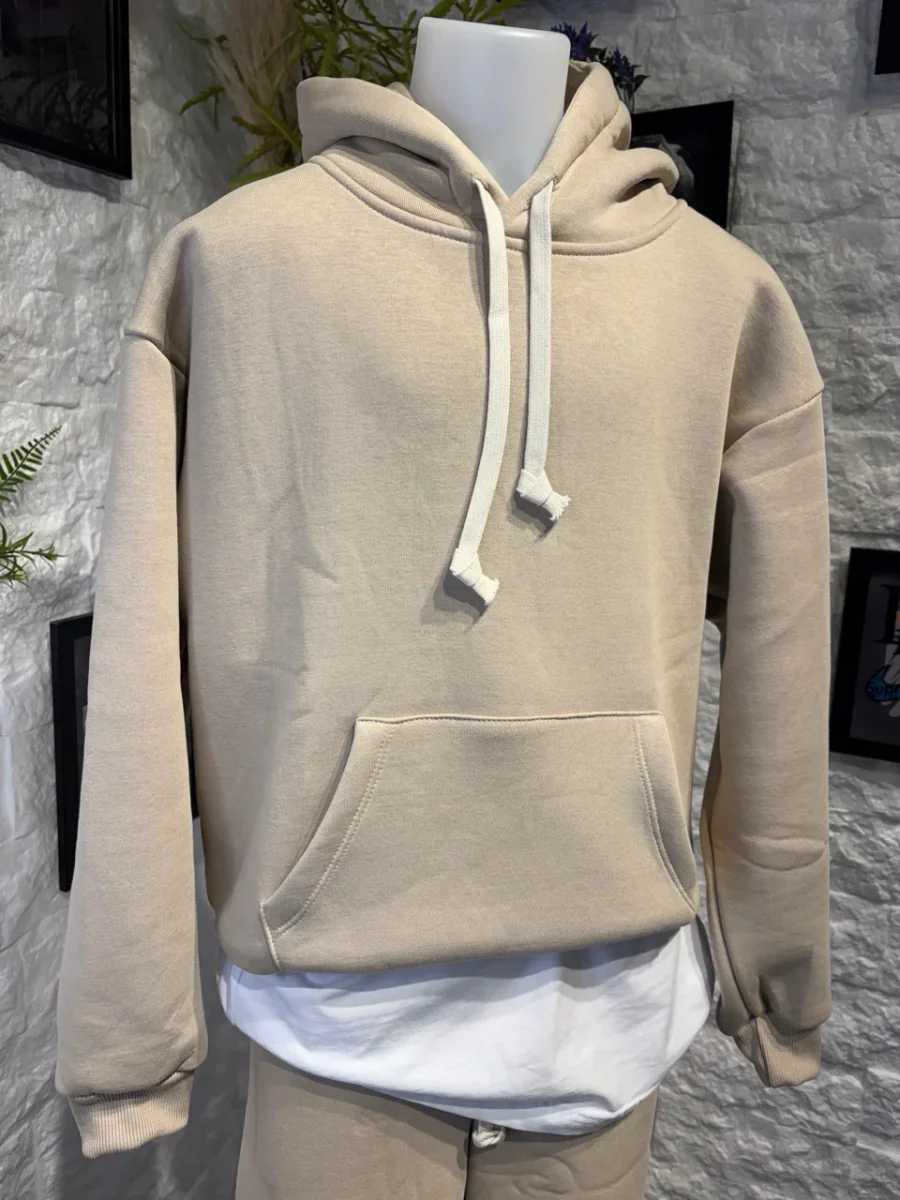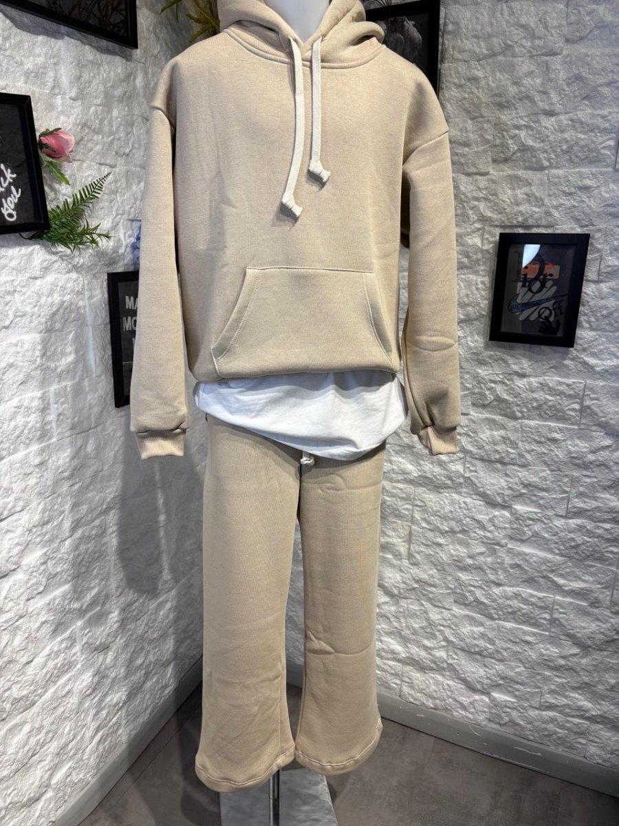 Completo in tuta felpata dal colore beige neutro e facile da abbinare, composto da felpa con cappuccio e tasca frontale e pantalone con elastico in vita e fondo ampio. Tessuto morbido e caldo, ideale per la stagione piรน fresca e per un look comodo ma curato anche nel quotidiano.