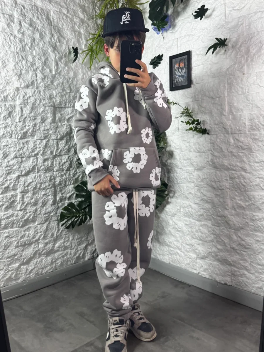 Completo grigio campus felpato con stampa a fiori bianchi – FELPATO 8-16 anni