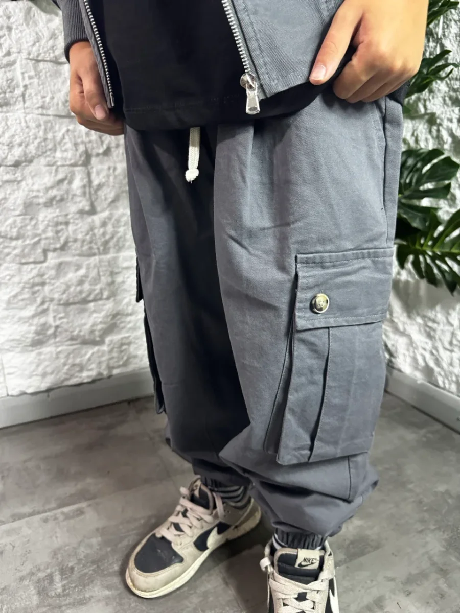 Completo grigio composto da giacca con zip frontale e cappuccio e pantalone modello cargo baggy. La giacca presenta tasche laterali e polsini elasticizzati, mentre il pantalone ha tasconi applicati, vita elasticizzata con laccio e fondo con elastico.