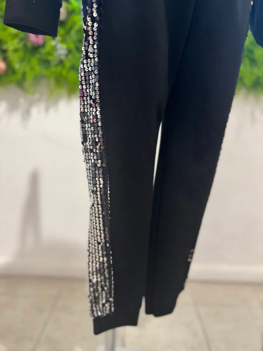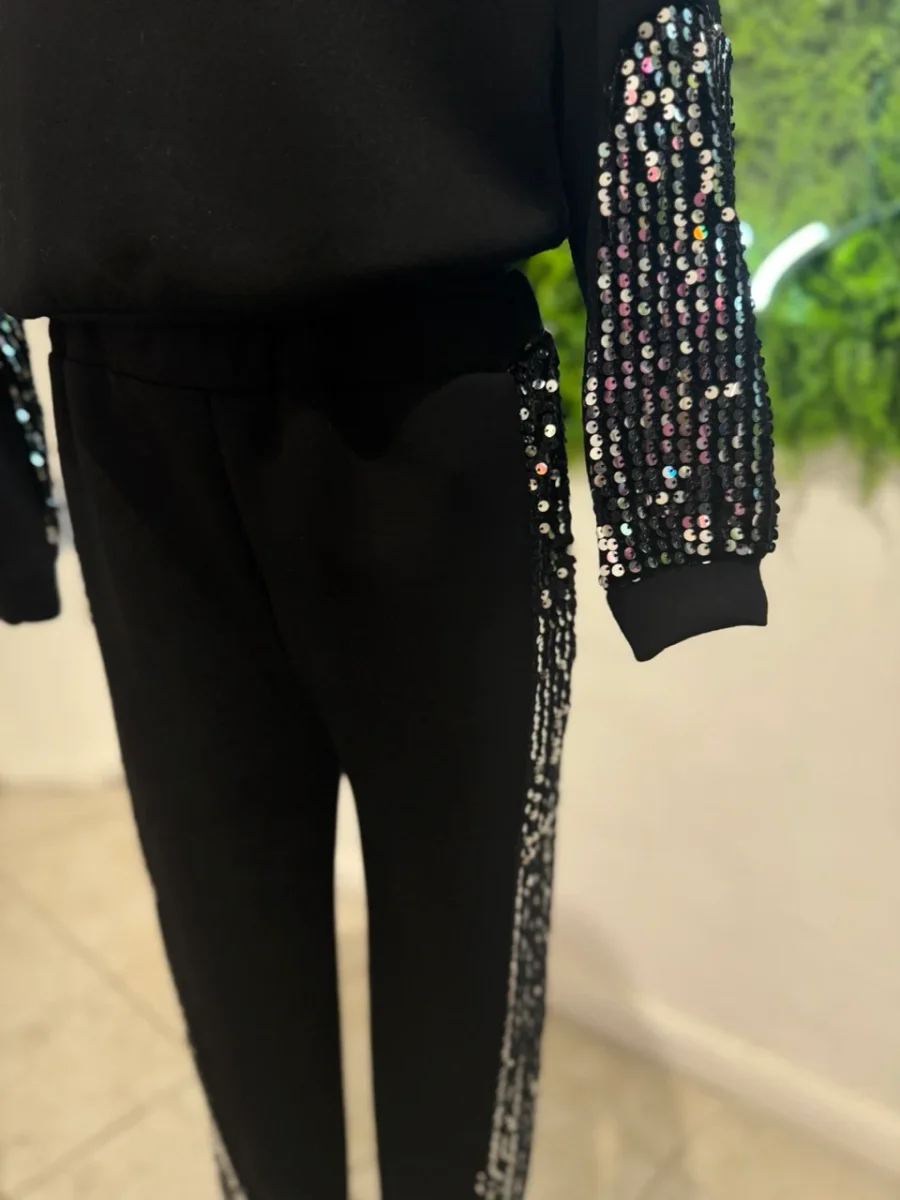 Completo composto da felpa girocollo e pantalone coordinato nero con dettagli in paillettes lungo le maniche e sui lati del pantalone. Modello pratico ma dโimpatto, perfetto per chi ama un look sportivo con un tocco luminoso. Interno garzato ideale per la stagione piรน fresca.