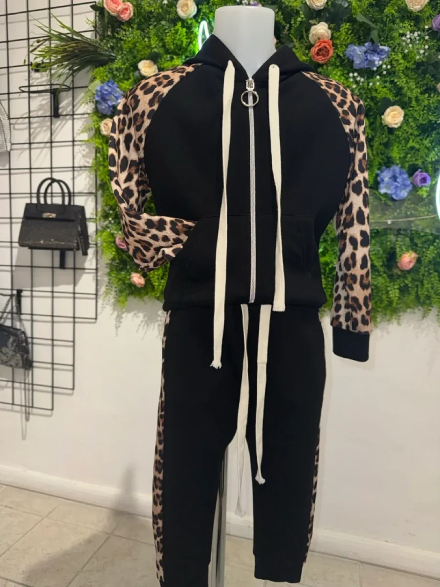 Completo in tuta composto da felpa con cappuccio e zip frontale con dettaglio anello e pantalone coordinato. Modello nero con bande laterali leopardate a contrasto, realizzato in tessuto garzato ideale per la mezza stagione.