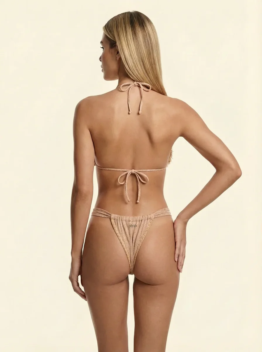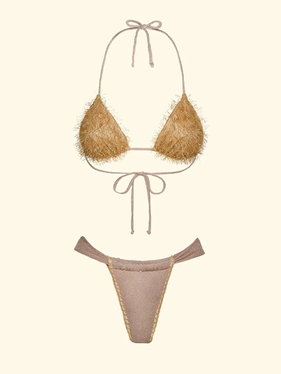 FK26-SW1121GD Tessuto: Lurex Dettagli: Capo dotato di imbottitura interna estraibile, ricami in cotone su slip e finitura effetti frange su coppe Modello Virtuale AI: Altezza simulata 175 cm, taglia S Composizione: 77%pl 17%mtl 6%ea Lavaggio: Si consiglia lavaggio a mano in acqua tiepida