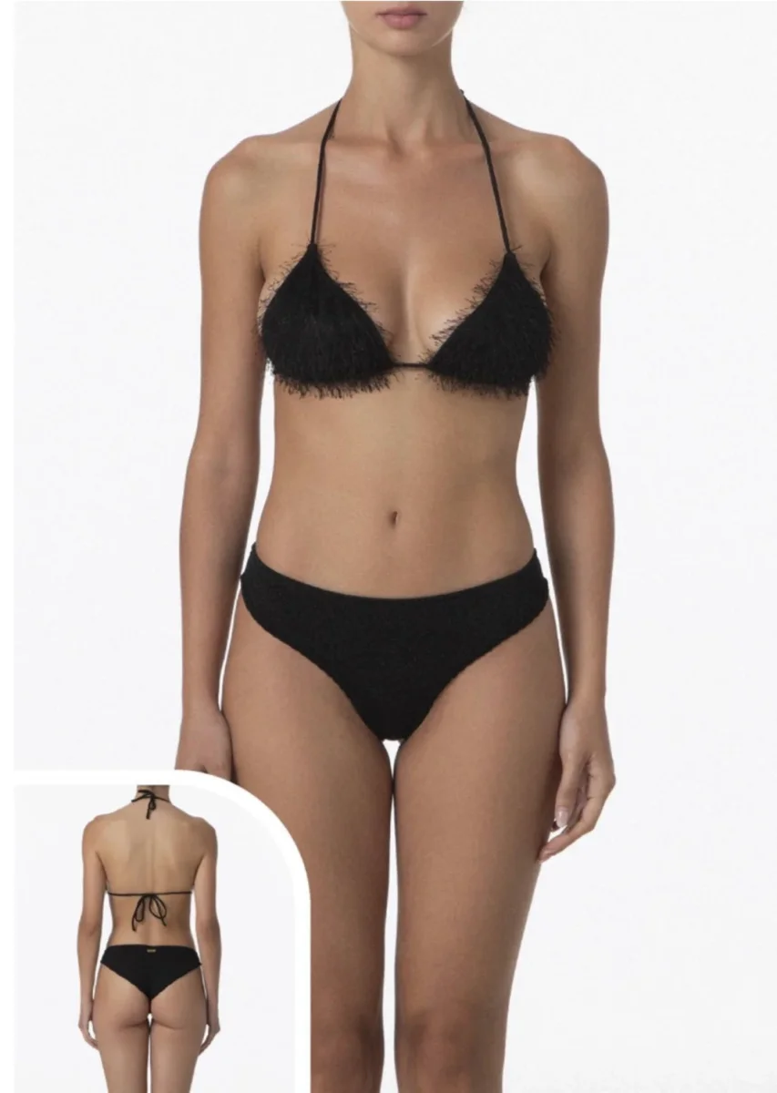 FK26-SW1122BK Tessuto: Lurex Dettagli: Capo dotato di imbottitura interna estraibile, ricami in cotone su slip e finitura effetti frange su coppe TRIANGOLO con laccetti regolabili CULOTTE FISSA Composizione: 77%pl 17%mtl 6%ea Lavaggio: Si consiglia lavaggio a mano in acqua tiepida