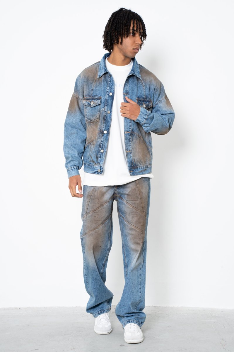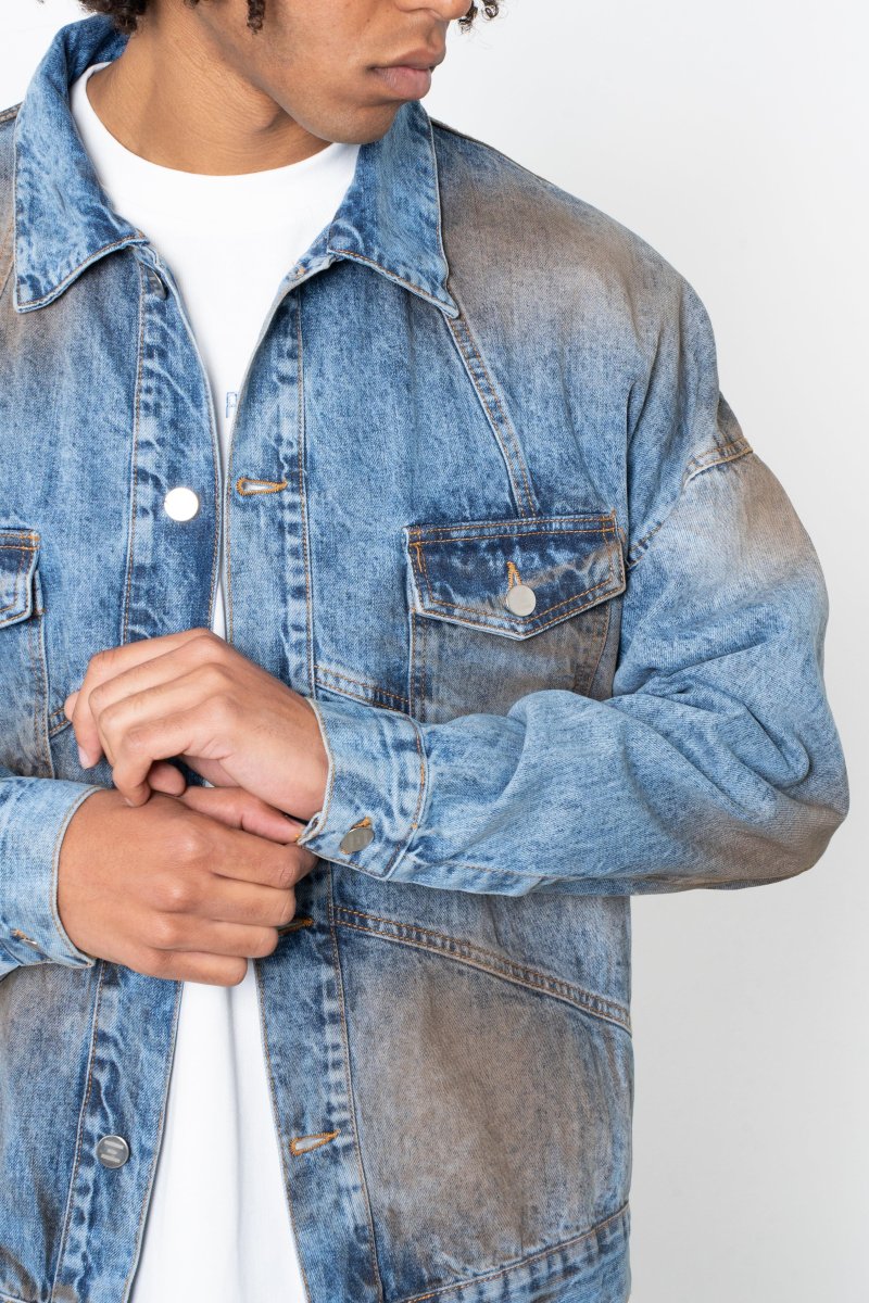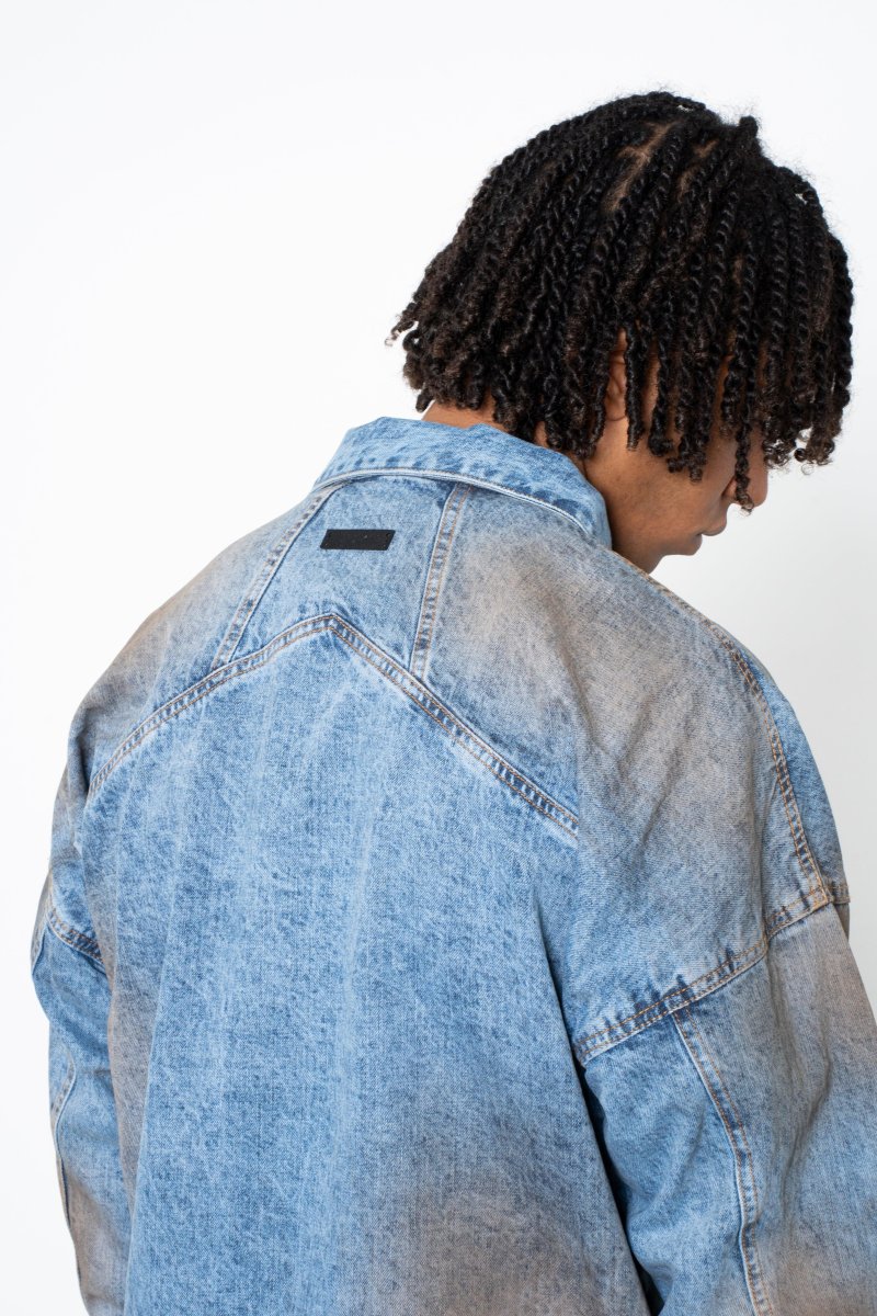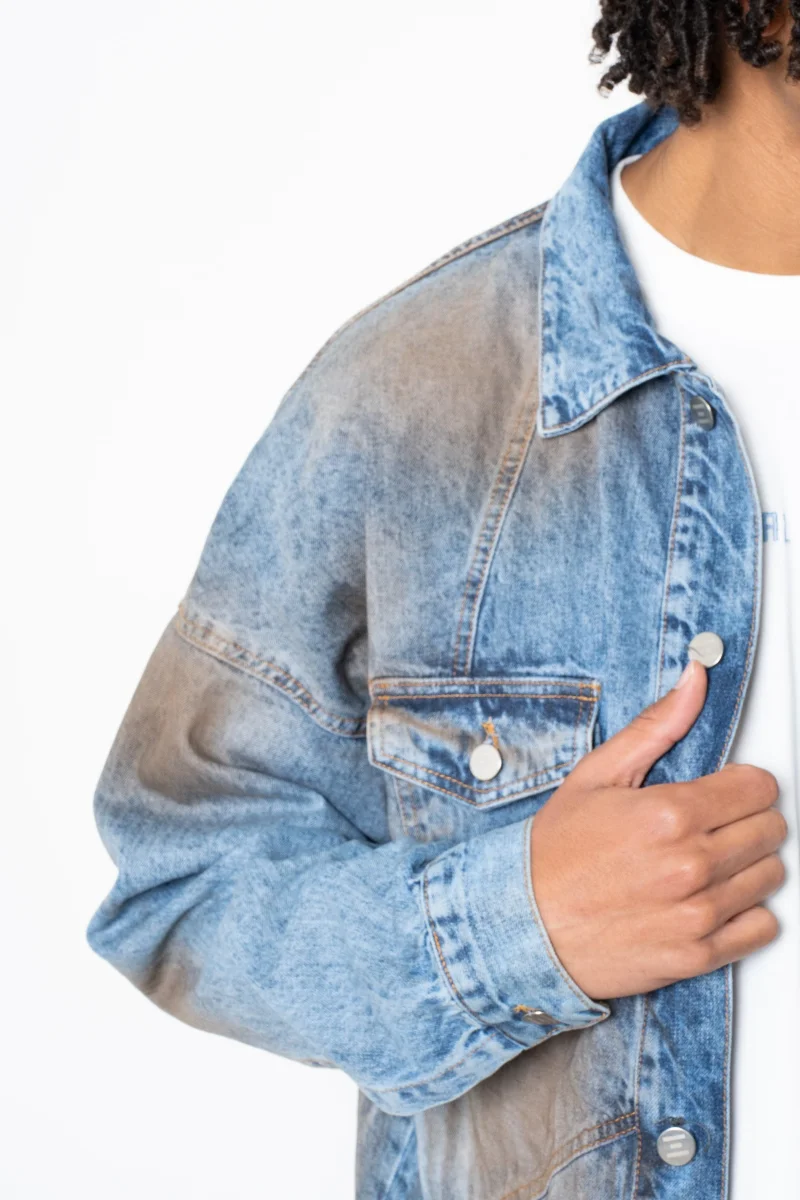 Giacca Jeans indigo gravel Eternal Il modello รจ alto 188cm ed indossa la taglia L Made in Italy