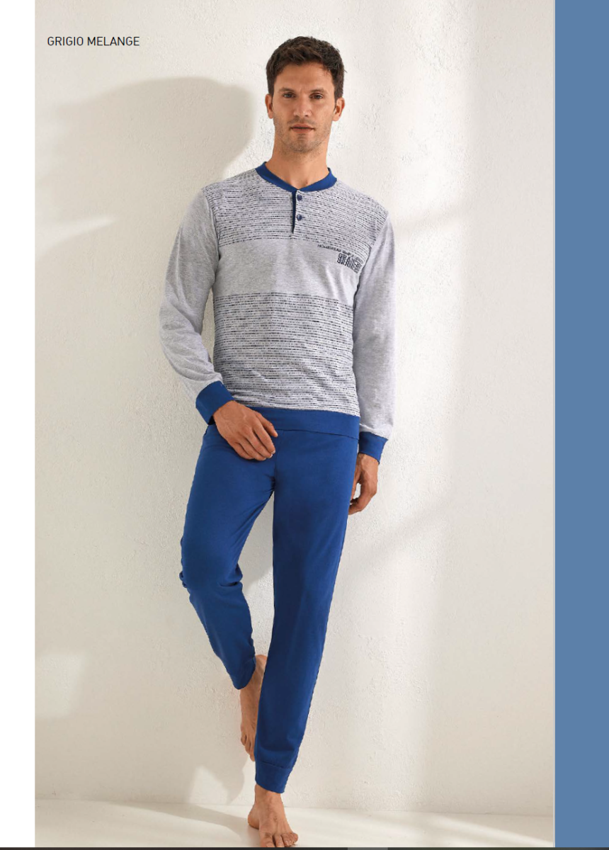 Pigiami da Uomo realizzati in Tessuto di Cotone piรน Morbido e Fresco a Maniche Lunghe e Pantaloni Lunghi,ย arricchiti da Polsini sulle Braccia e in vita.