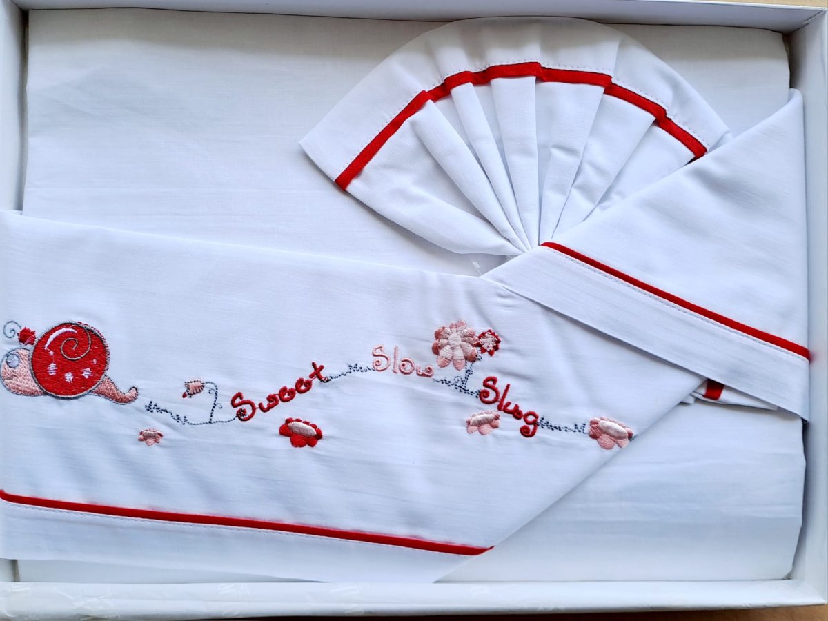 Set a Sfondo Bianco a Fasce Rosse con sopra una Lumaca Ricamata In Color Rosso e Rosa;