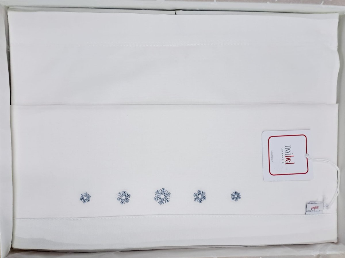 Set a Fantasia su sfondo Bianco con Piccoli Fiocchi di Neve di Colore Celeste.