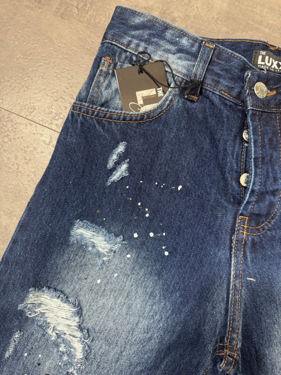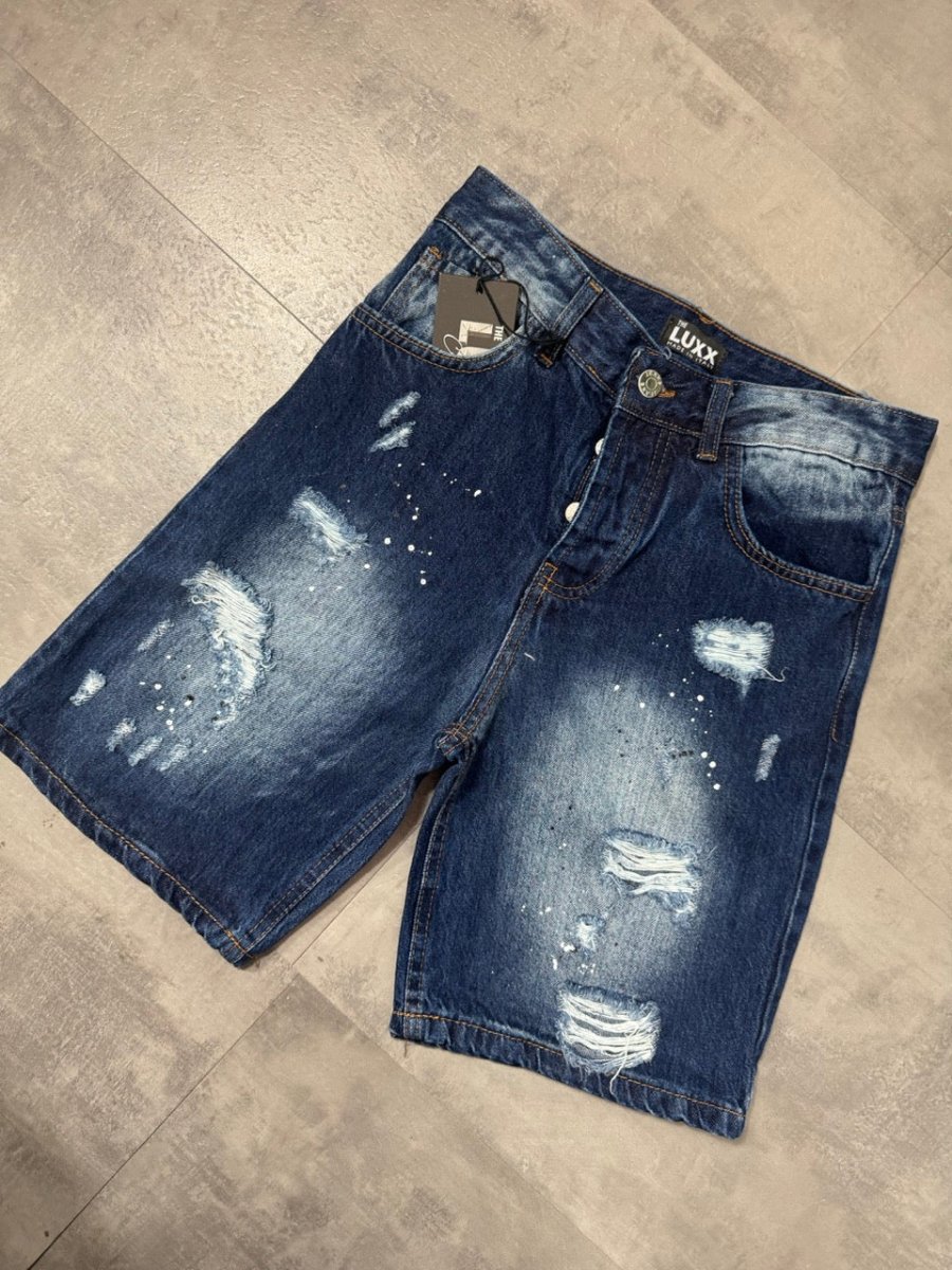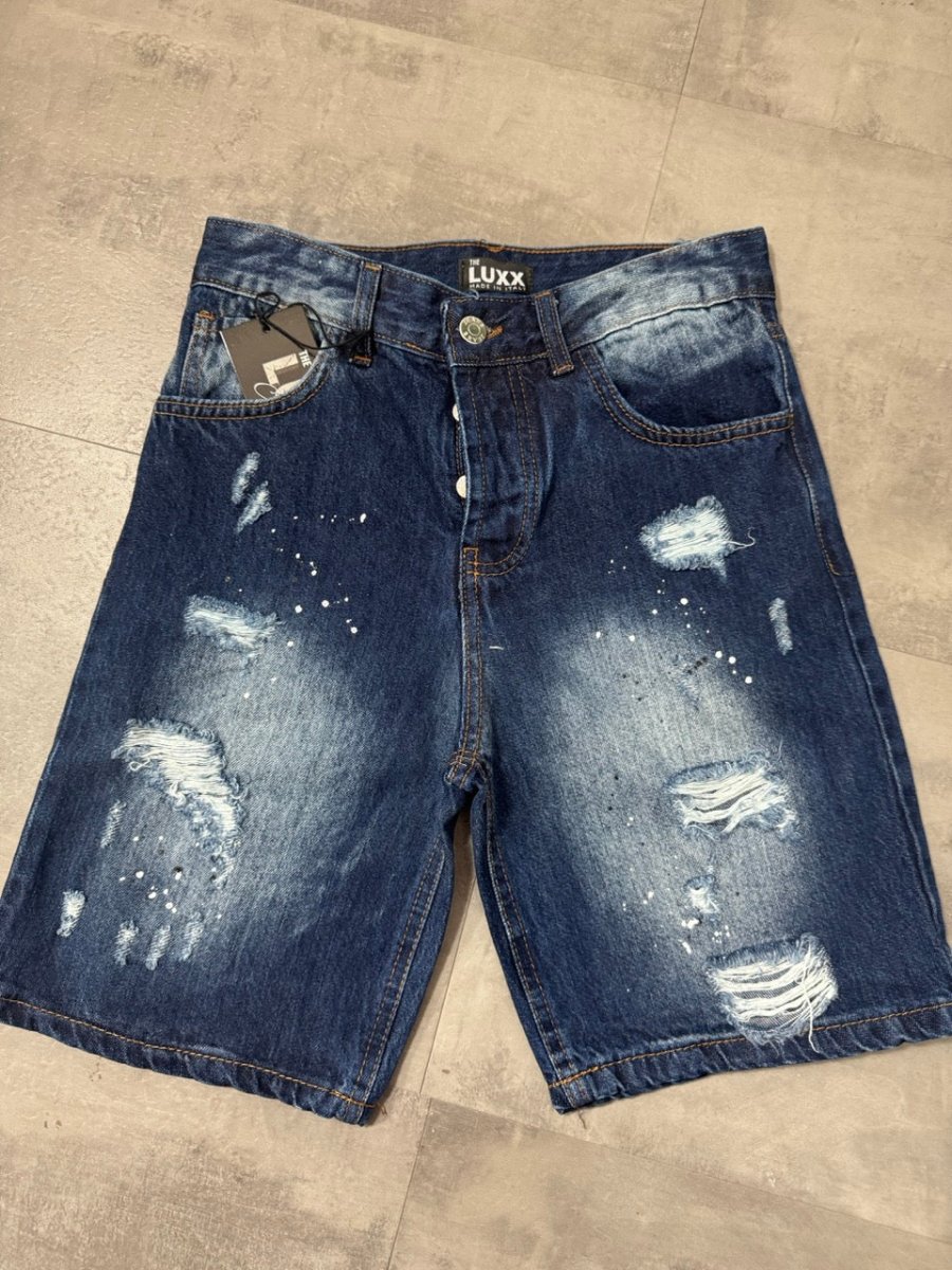 Pantaloncino bermuda blu in denim con strappi e schizzi di vernice Taglie disponibili: 10-12-14-16 anni