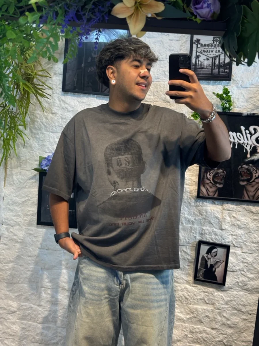 T-shirt antracite a manica corta con vestibilitร ampia e stampa centrale effetto vintage. La grafica raffigura un volto di spalle con catena al collo e scritta sul retro โMAKE UP YOUR MINDโ, per uno stile street deciso e contemporaneo. Vestibilitร : OVERSIZETaglia: dalla S alla XLVeste: ampiaConsiglio di stile: perfetta con jeans baggy o pantaloni cargo […]