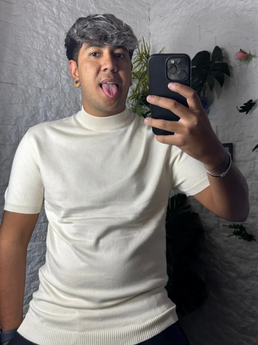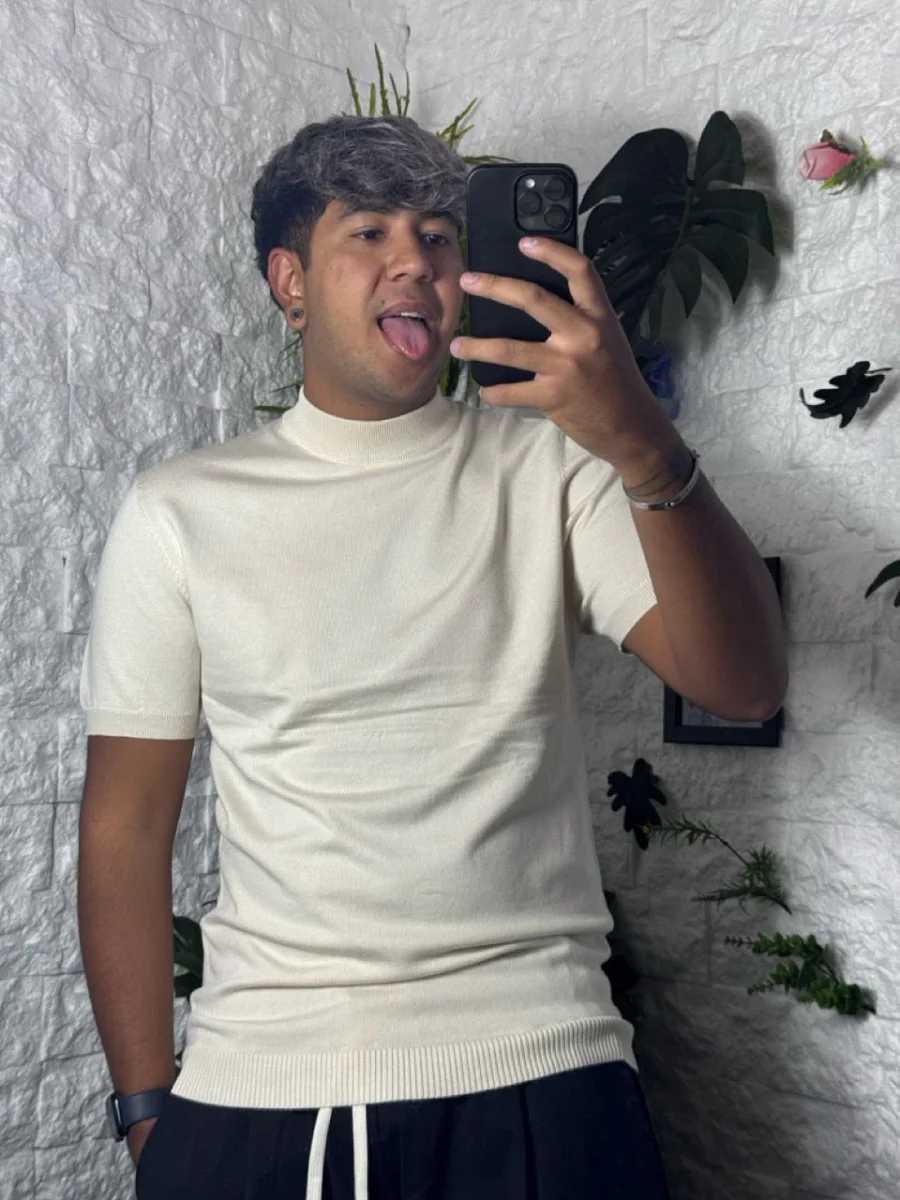 T-shirt beige slim in maglia con mezzo collo alto Taglie disponibili: S-M-L-XL