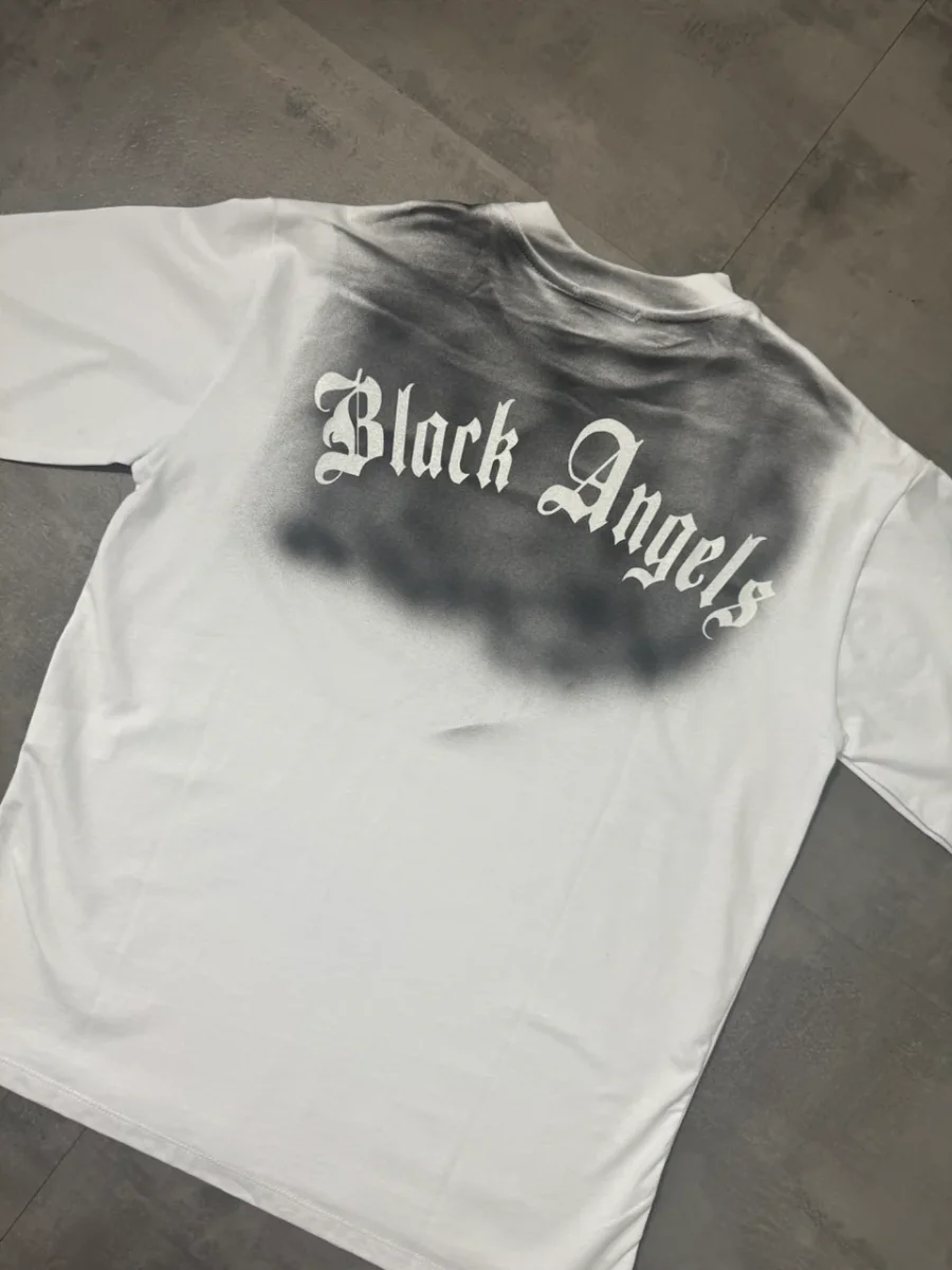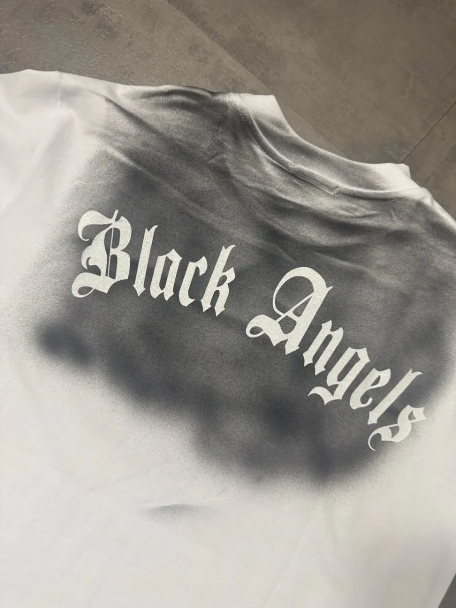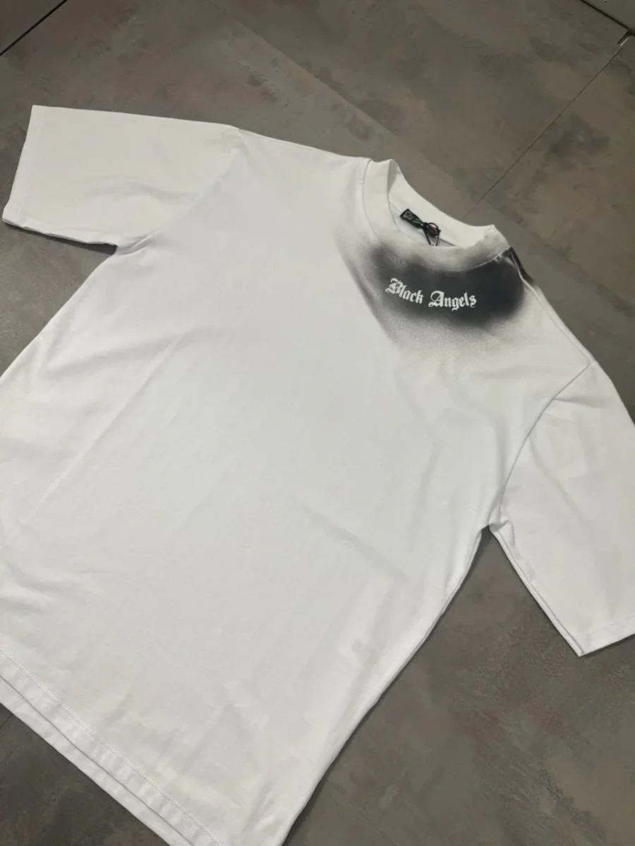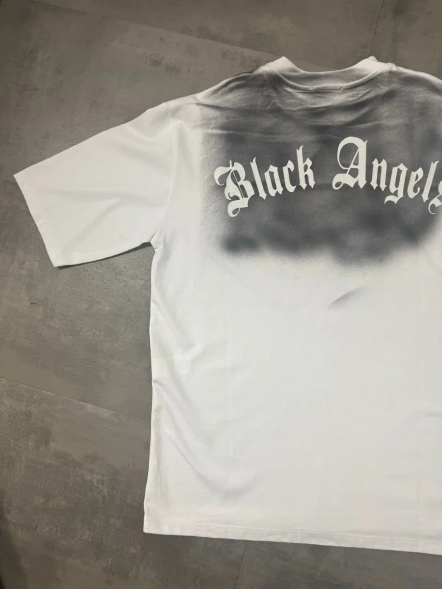 T-shirt bianca con mezzo collo alto e scritta “BLACK ANGELS” fumè – OVERSIZE