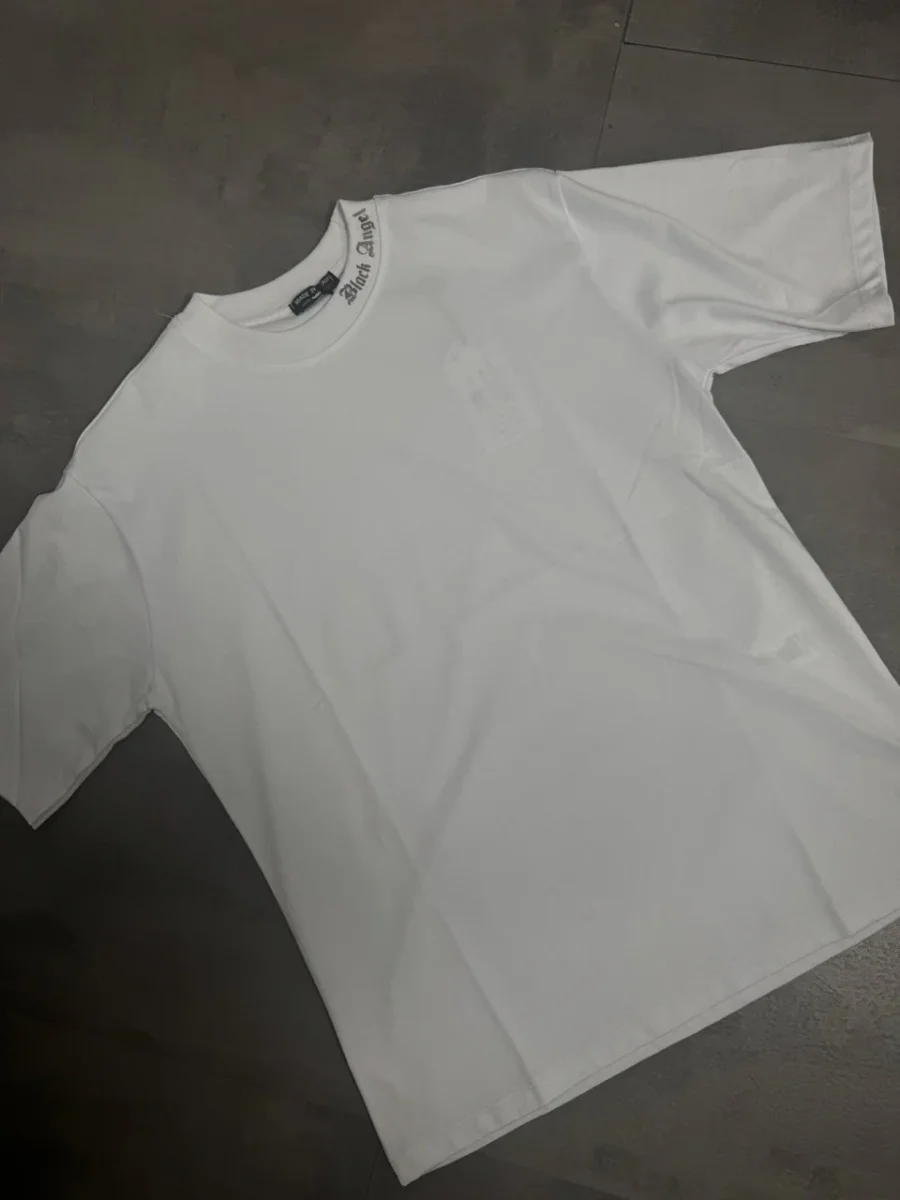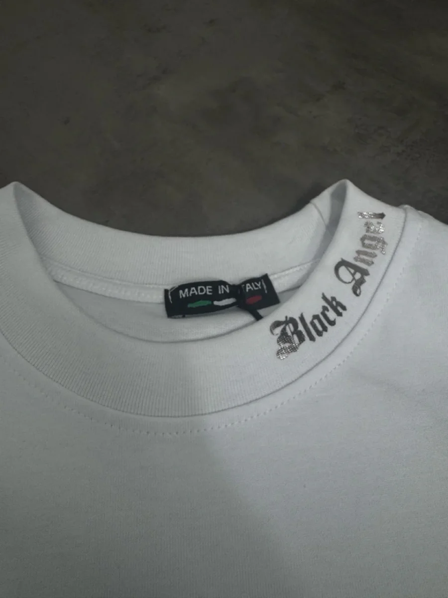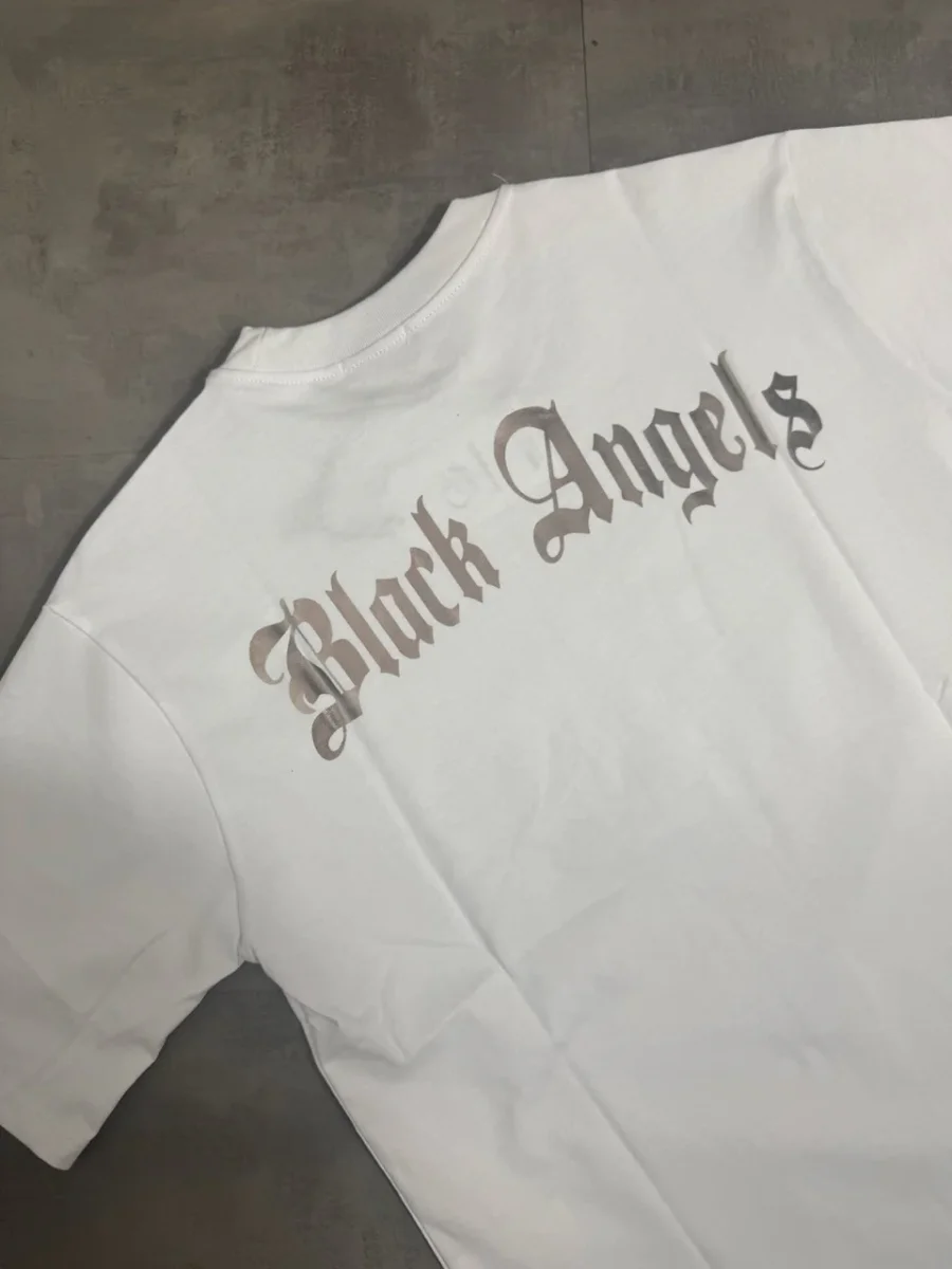 T-shirt bianca con mezzo collo alto e scritta “BLACK ANGELS” metal – OVERSIZE