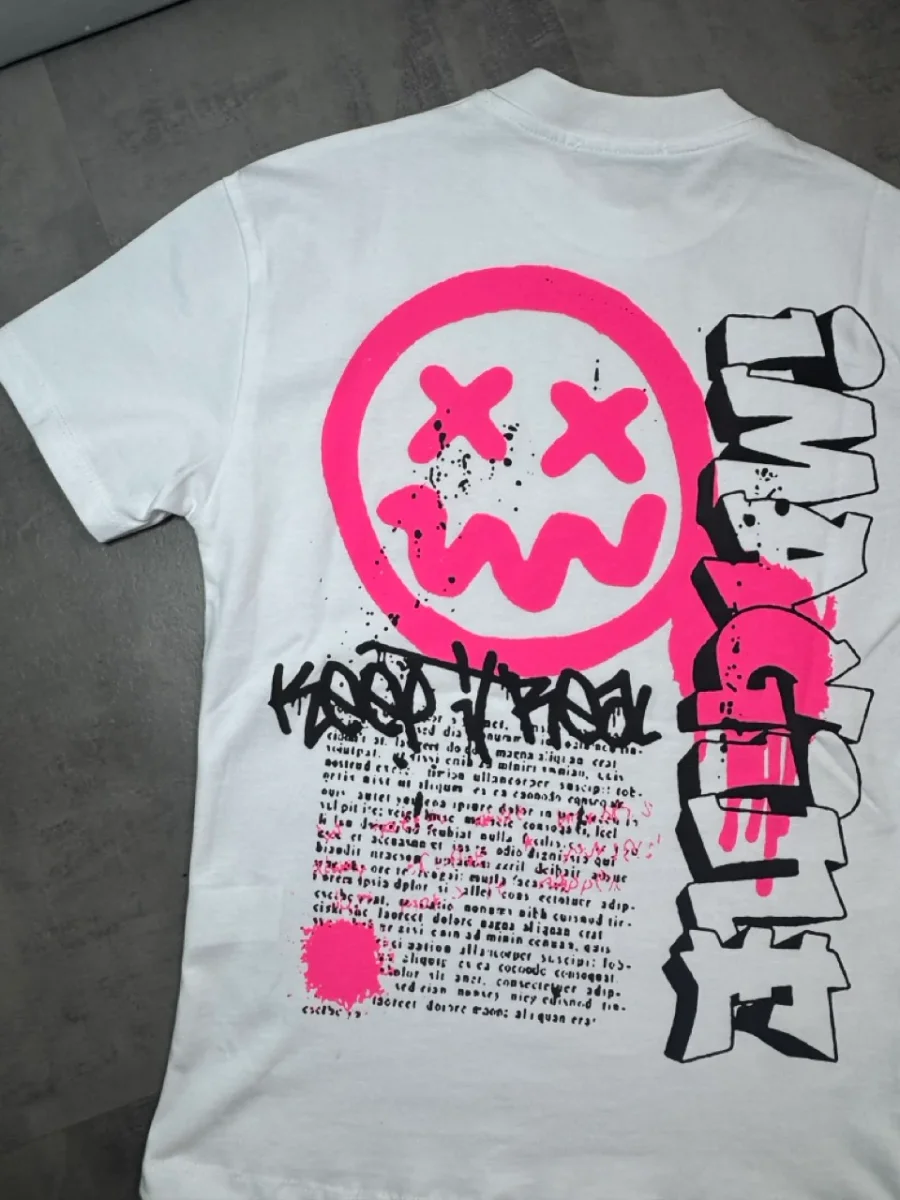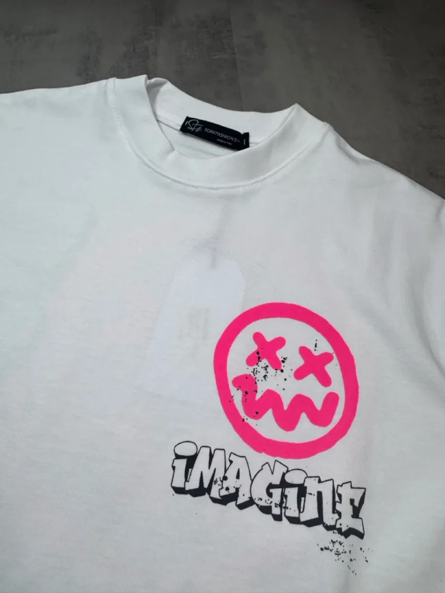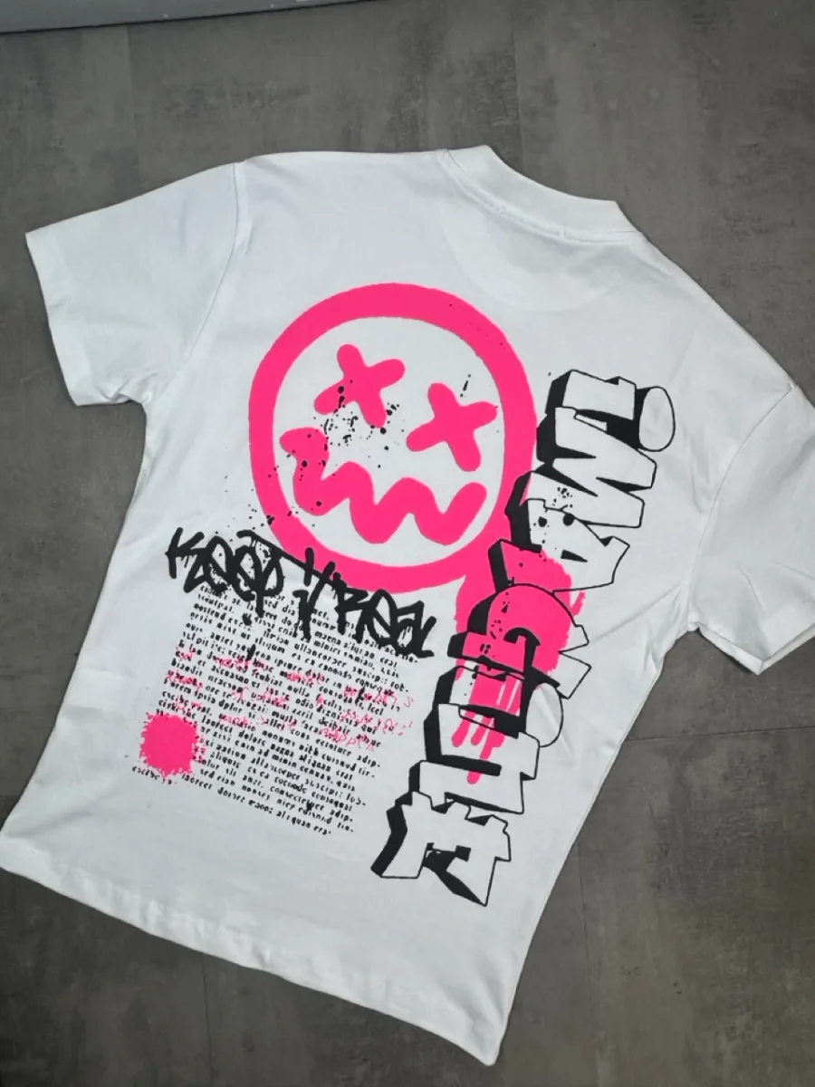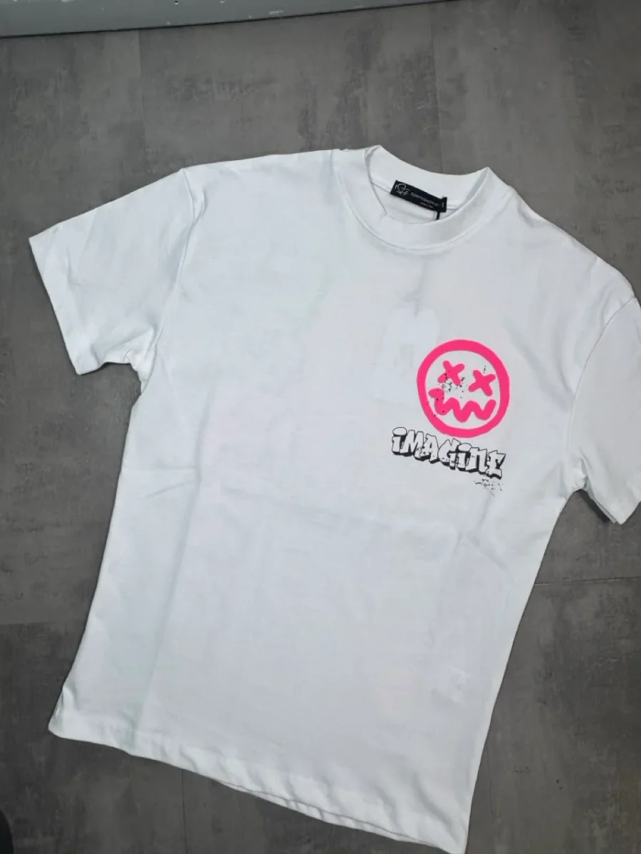 T-shirt bianca a manica corta con mezzo collo alto e stampa smile fucsia a contrasto sul petto. Modello dal taglio ampio, ideale per uno stile street moderno e riconoscibile.