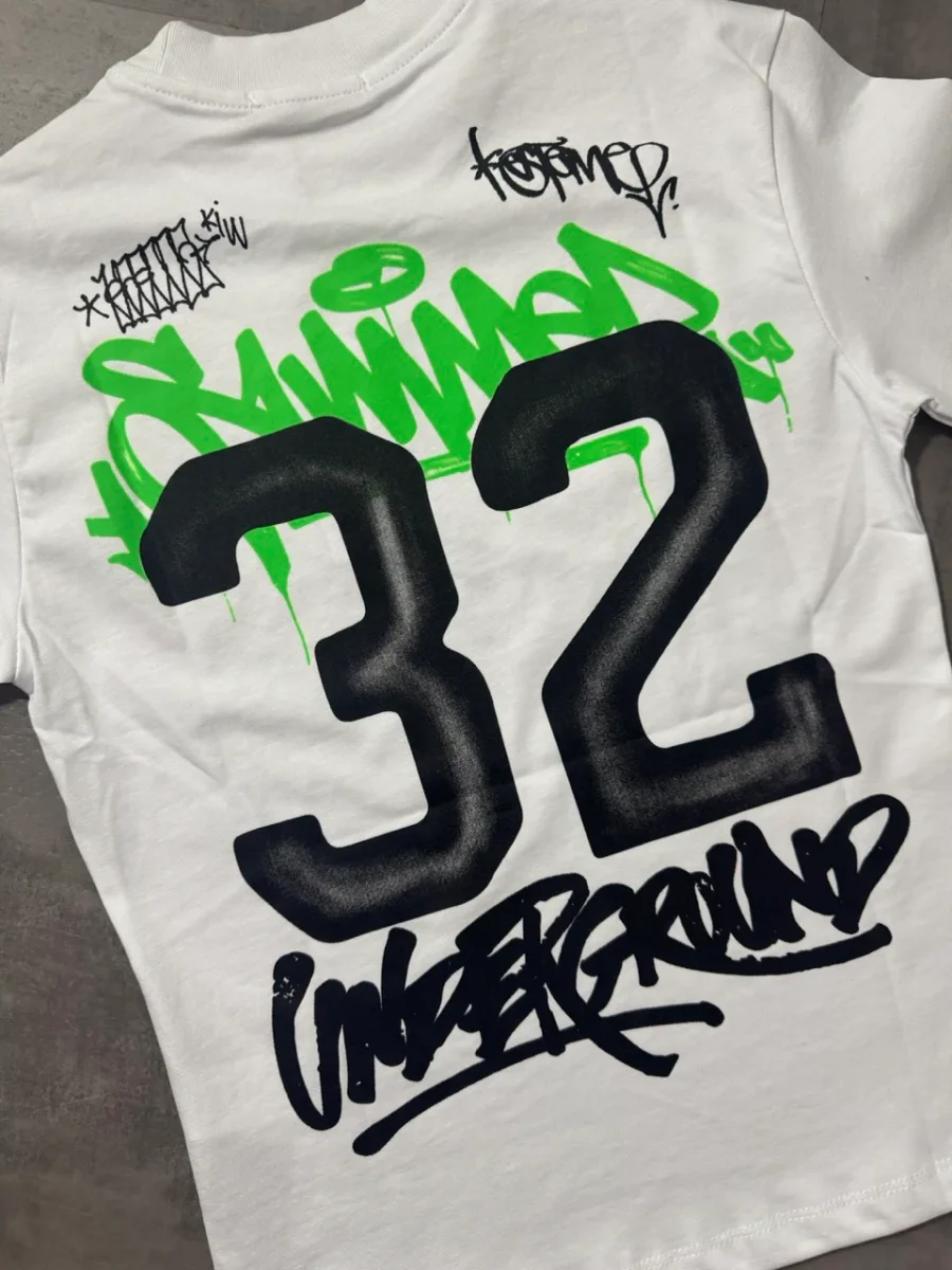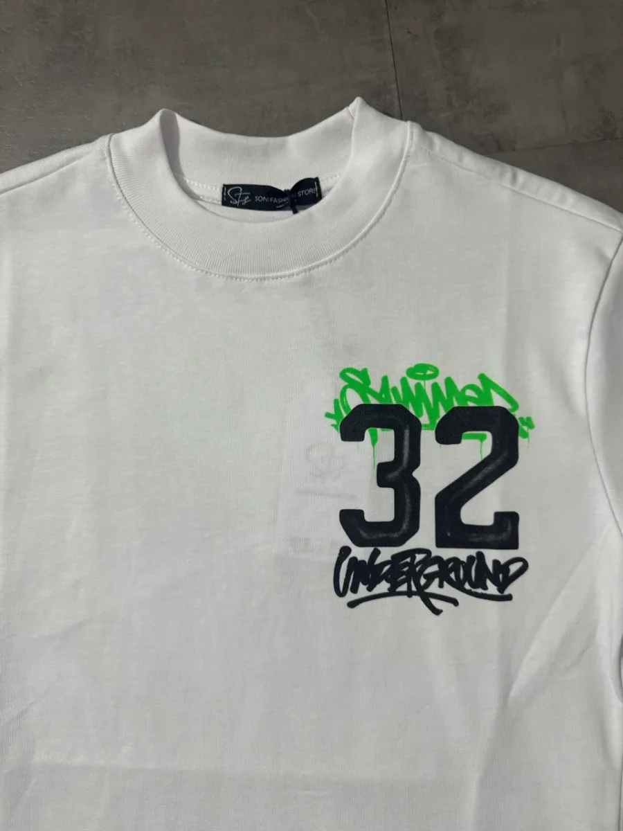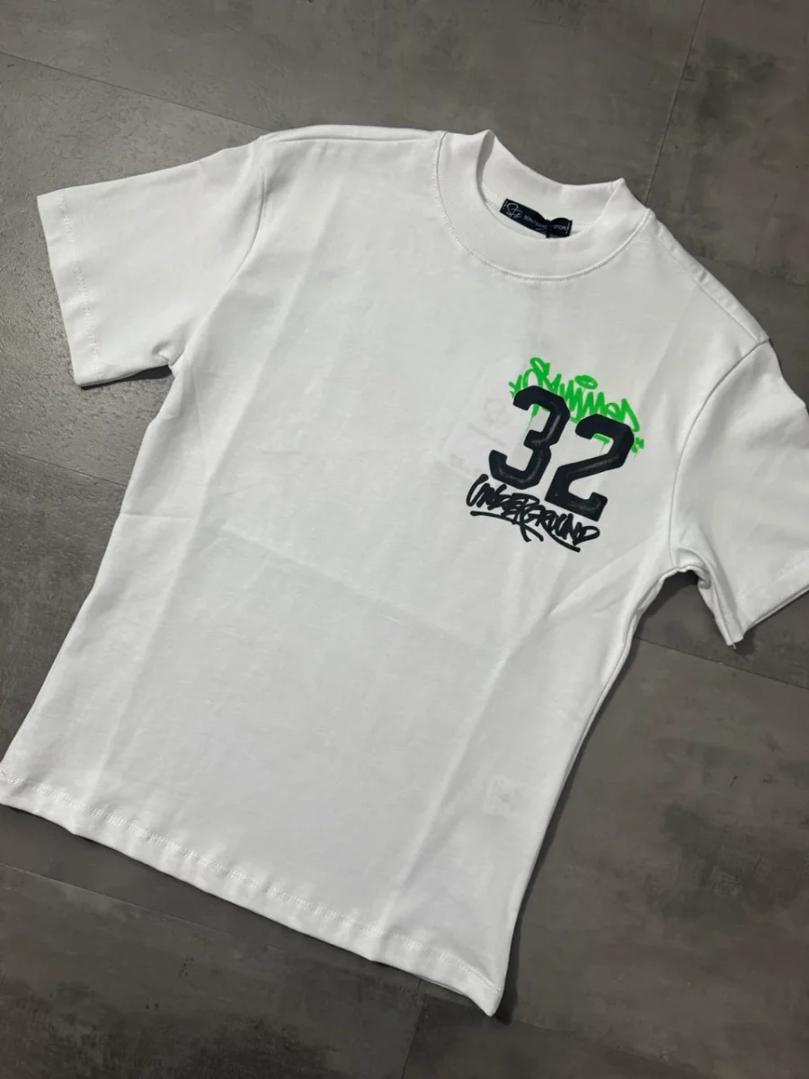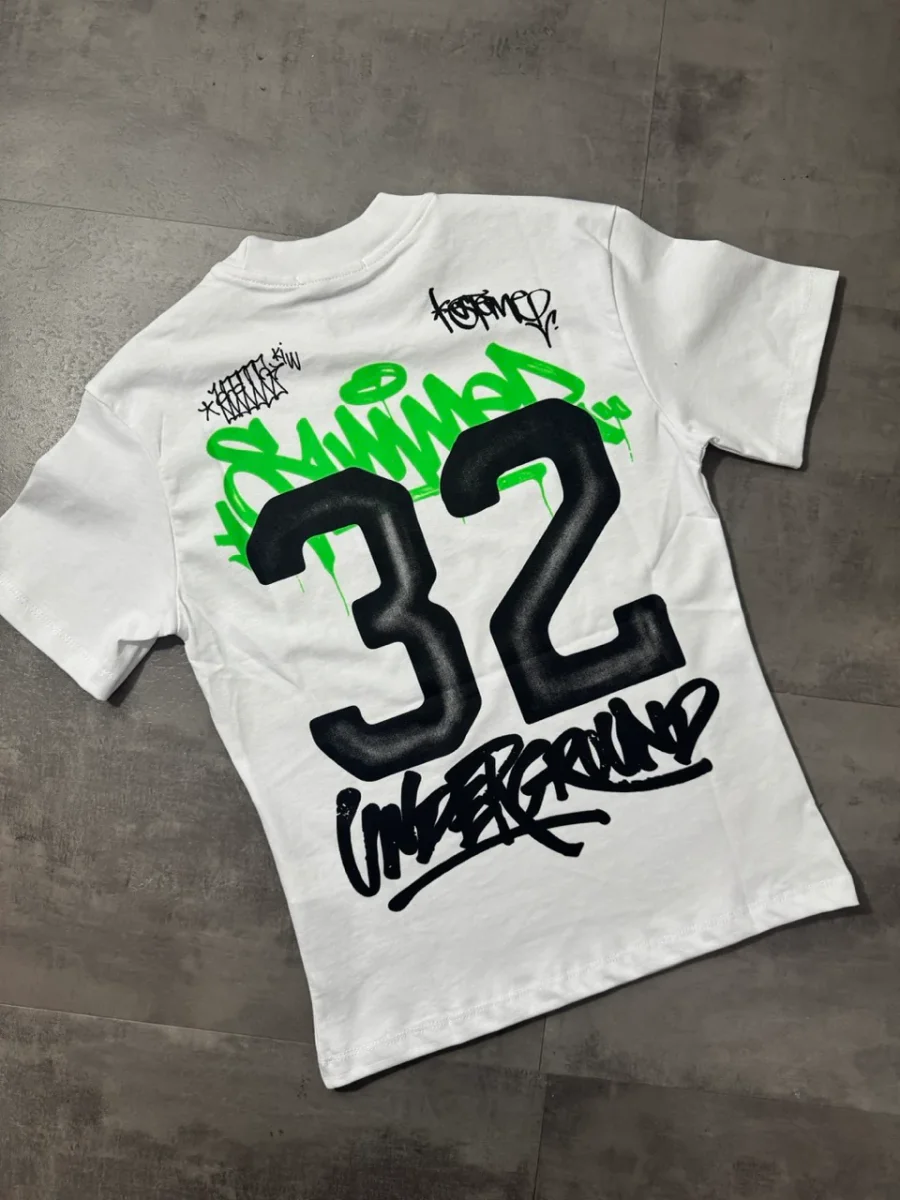 T-shirt bianca a manica corta con stampa frontale “32 UNDERGROUND” in contrasto verde fluo e nero effetto graffiti. Modello dal taglio ampio, ideale per uno stile street deciso e contemporaneo.