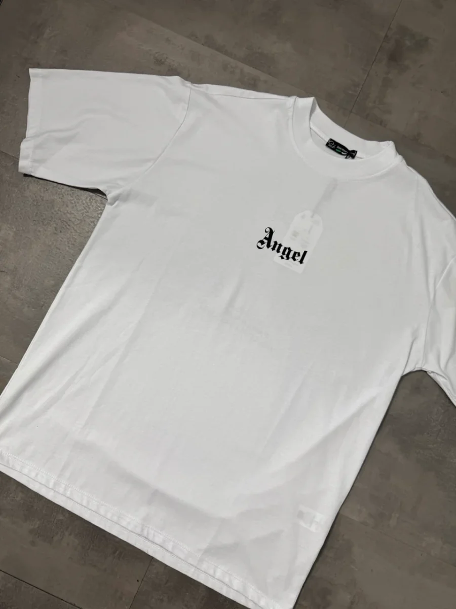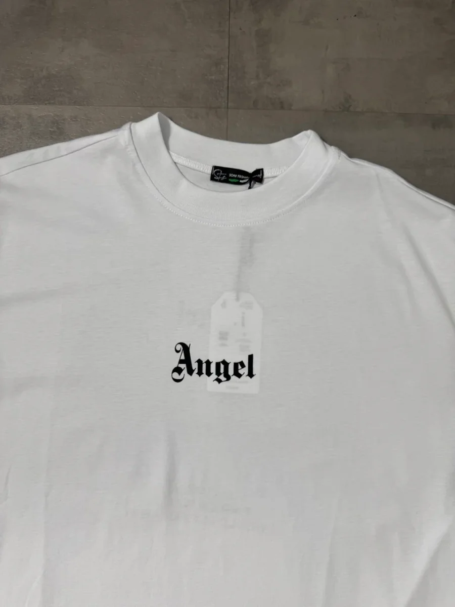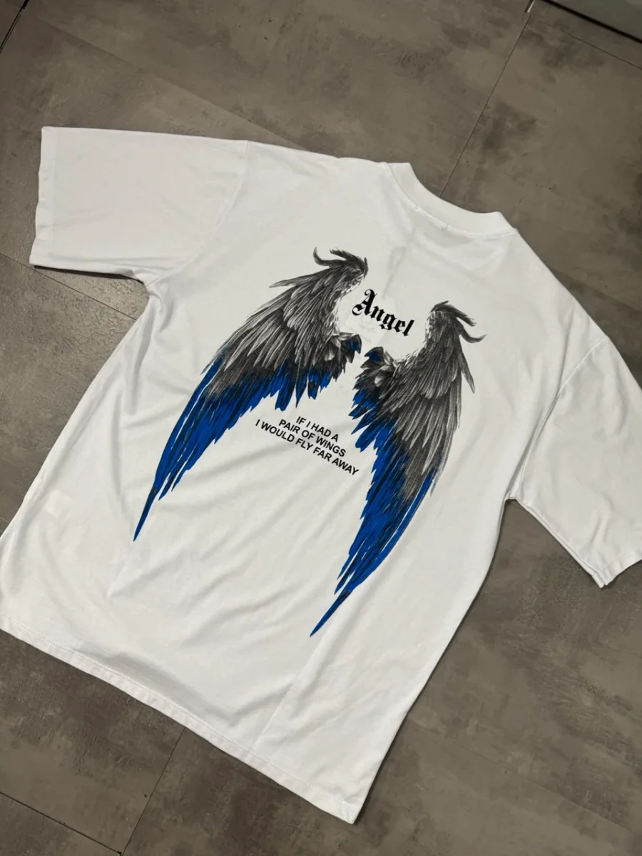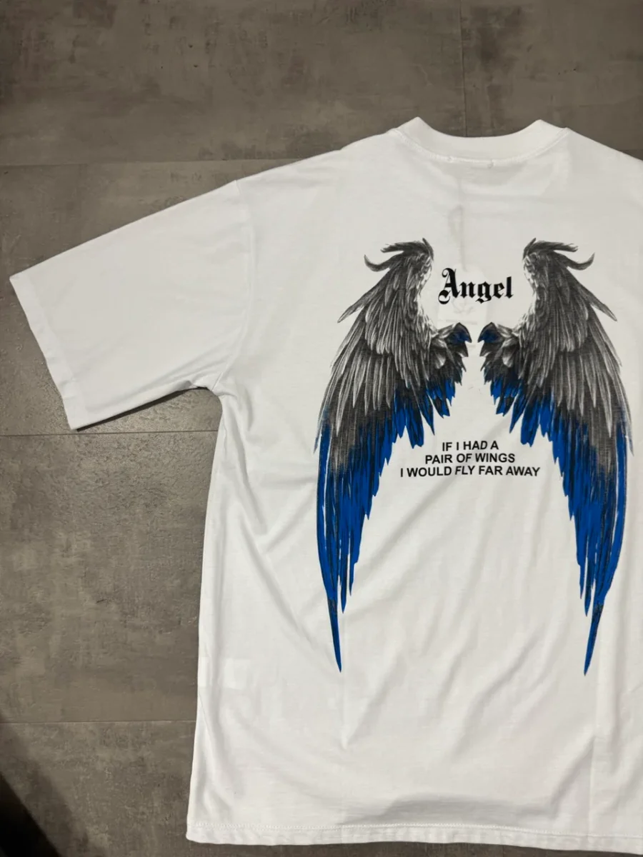 T-shirt bianca a manica corta con maxi stampa sul retro con ali blu a contrasto e scritta “ANGEL”. Modello dal taglio ampio, ideale per uno stile street deciso e contemporaneo.