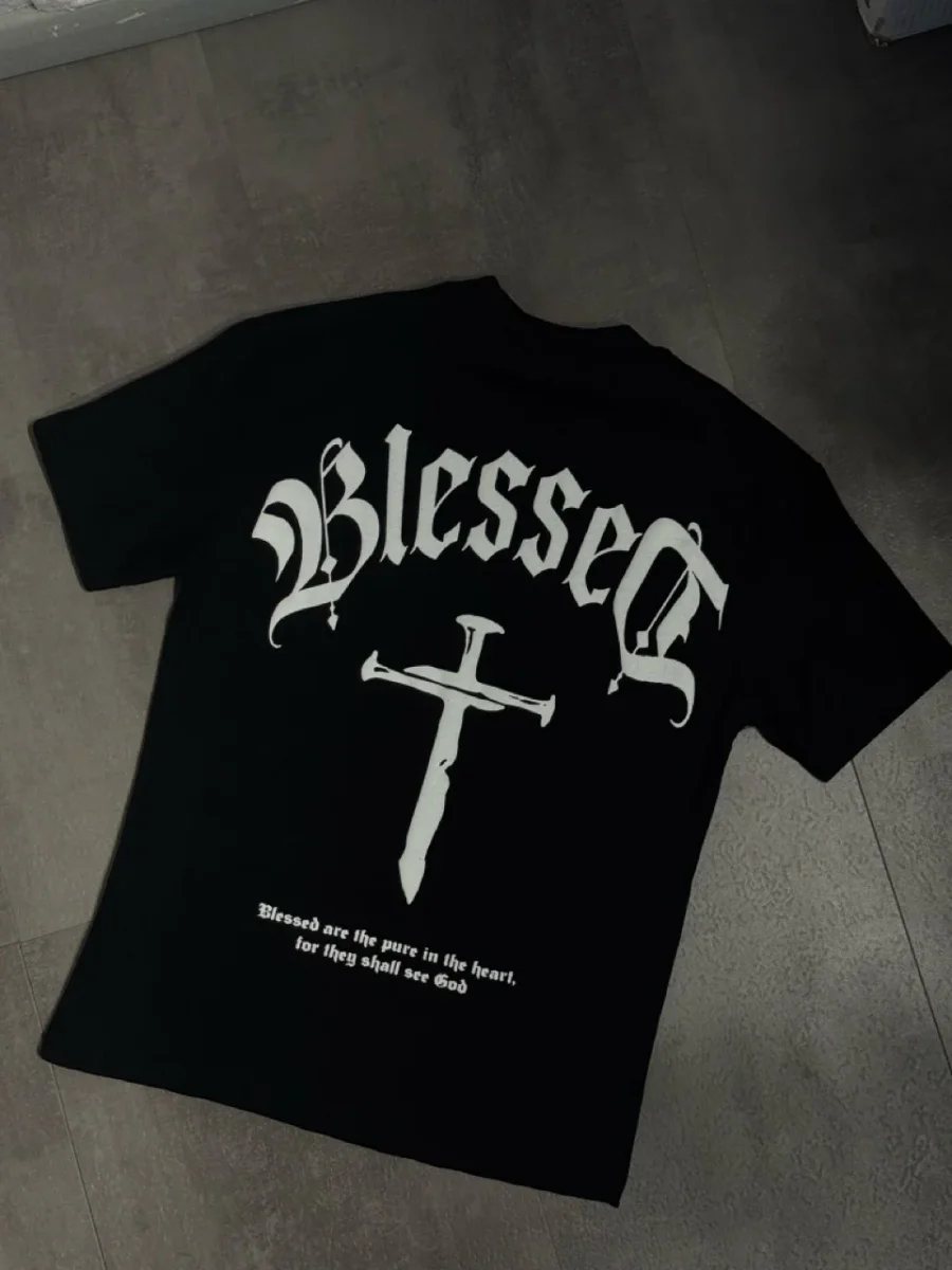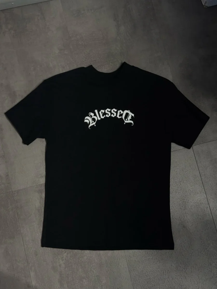 T-shirt bianca a manica corta con stampa frontale “BLESSED” in stile gotico e maxi stampa posteriore con scritta e croce centrale. Modello dal taglio ampio con vestibilitร oversize, ideale per look street dal carattere deciso.