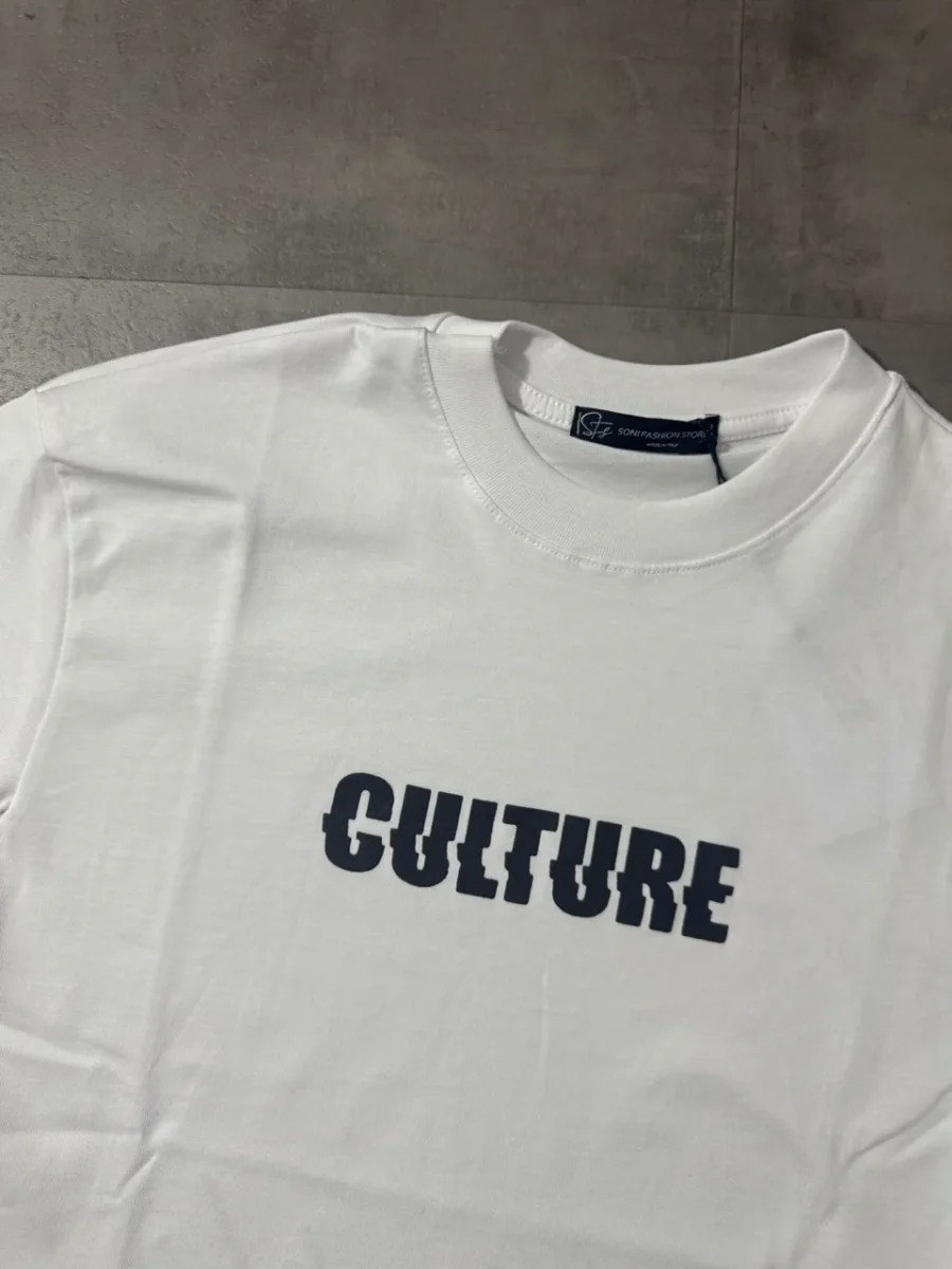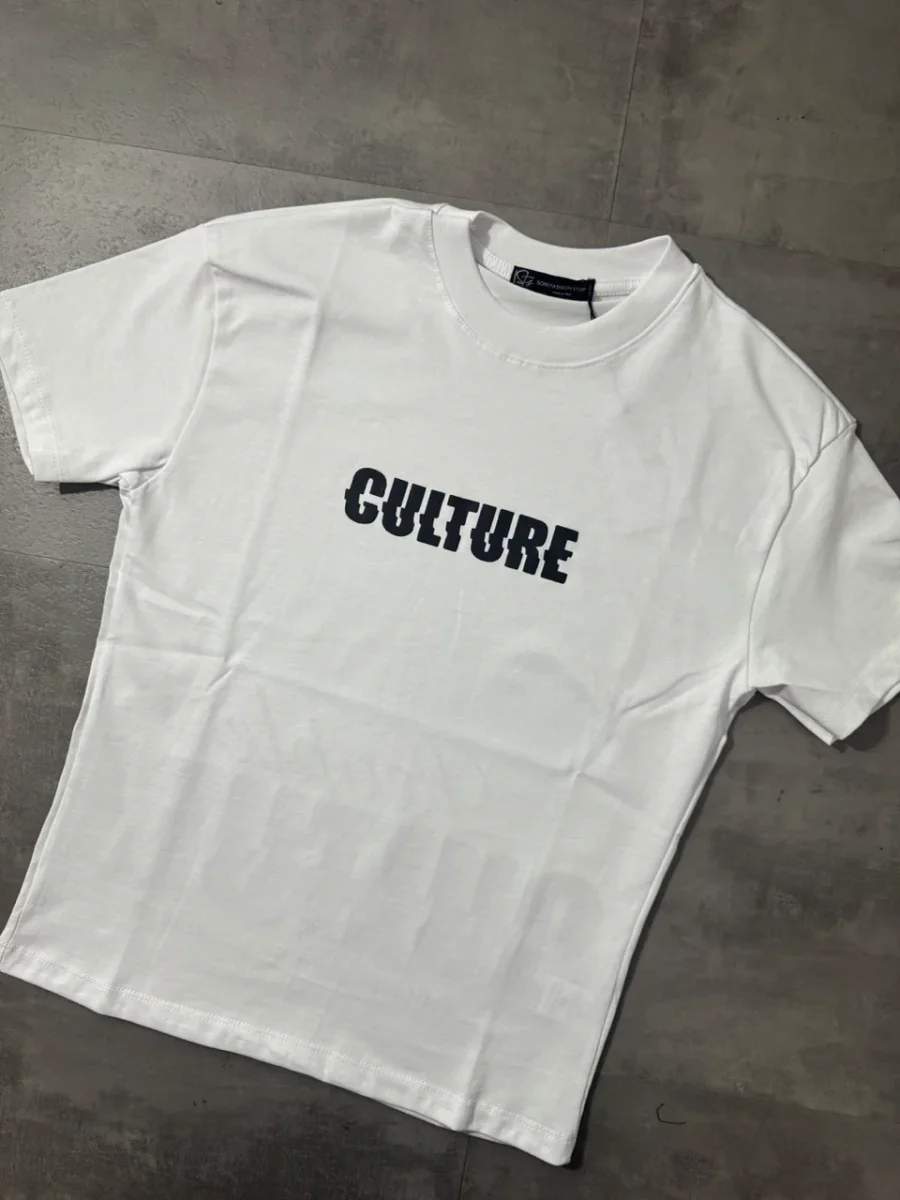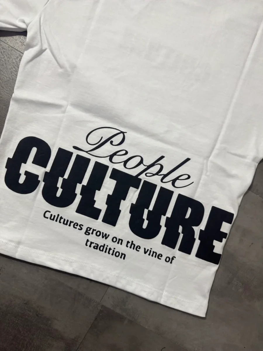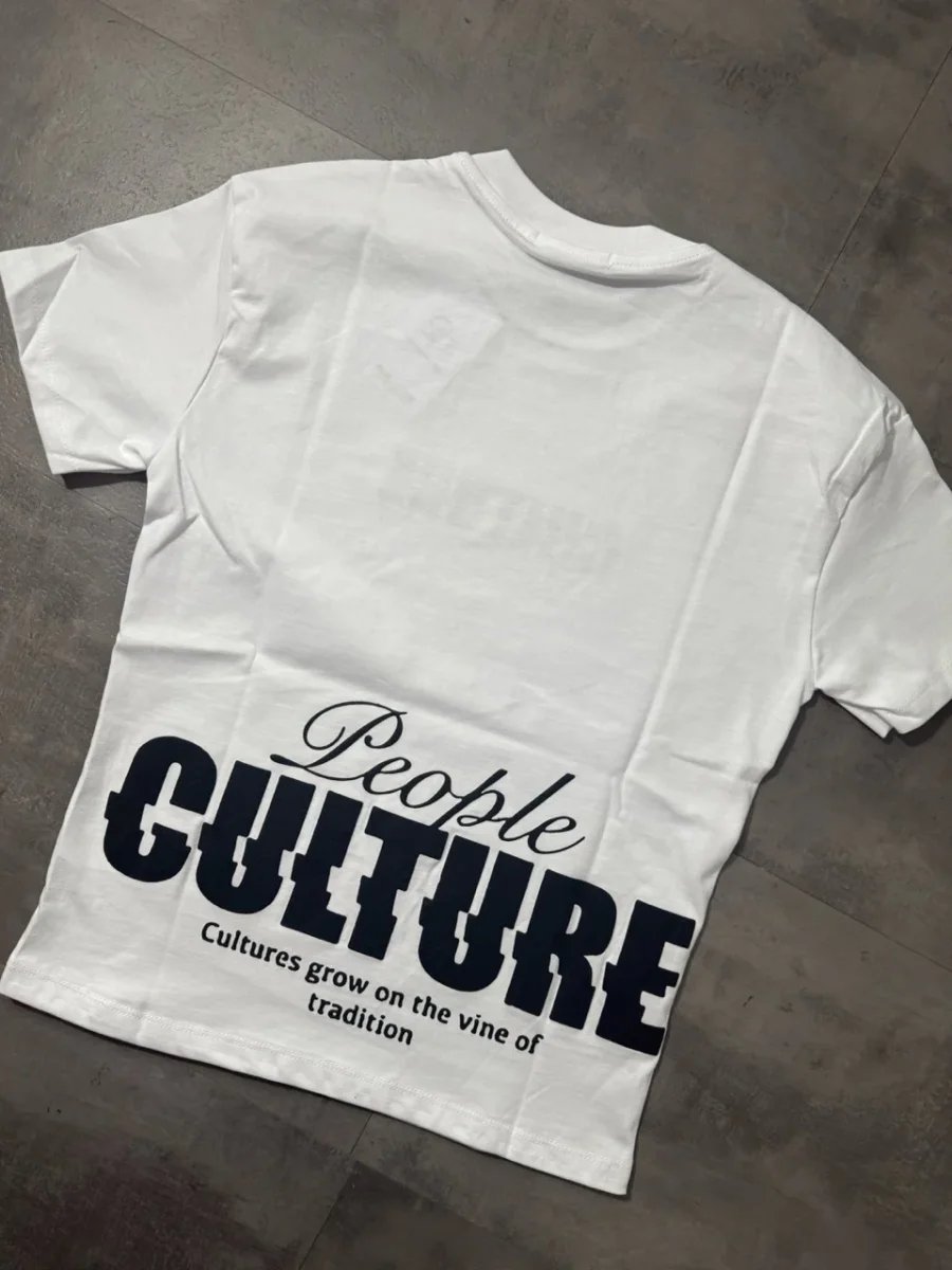 T-shirt bianca a manica corta con stampa frontale “CULTURE” a contrasto e maxi stampa sul retro con scritta People Culture e lettering grafico. Modello dal taglio ampio, pensato per uno stile street deciso e contemporaneo.