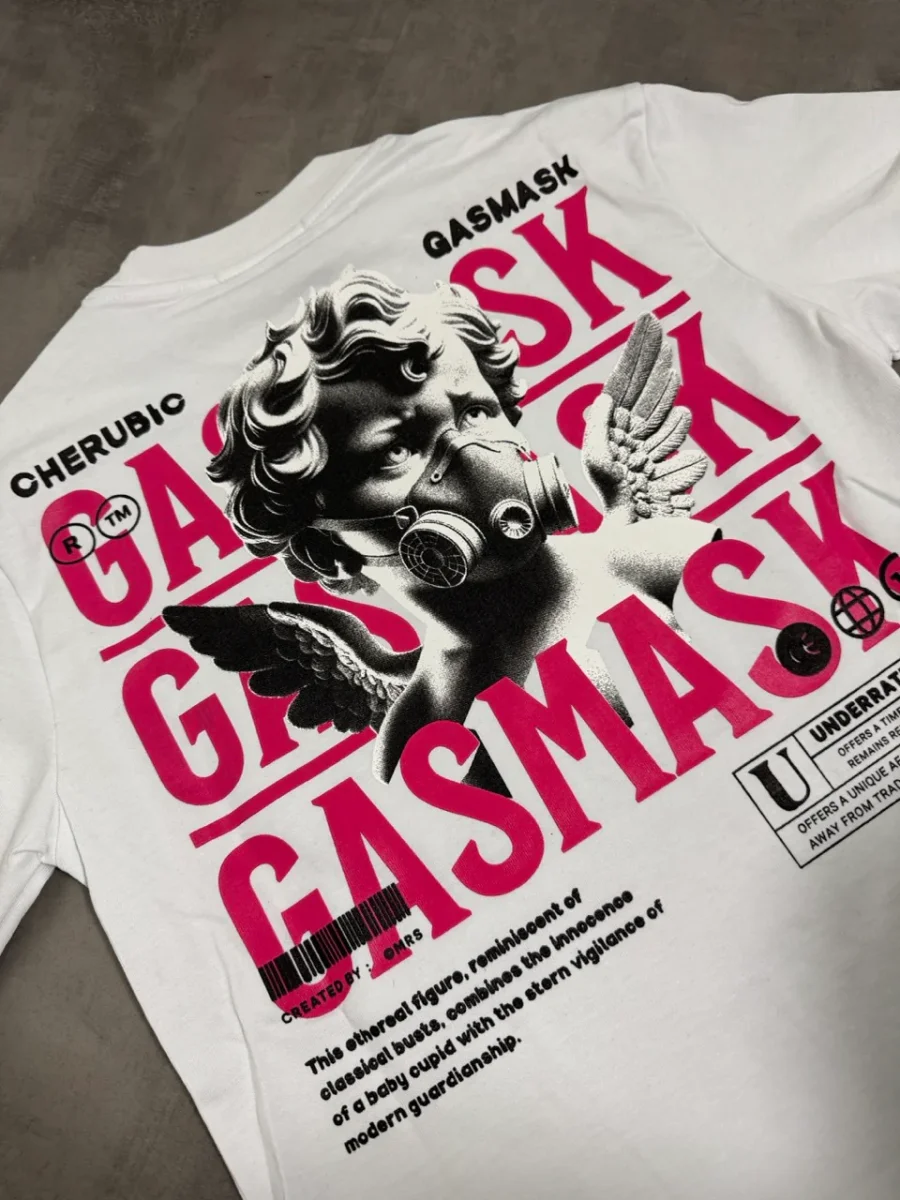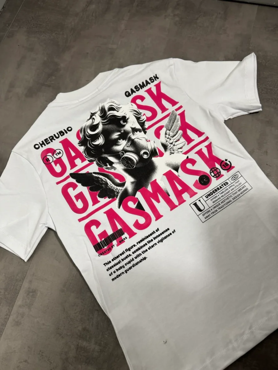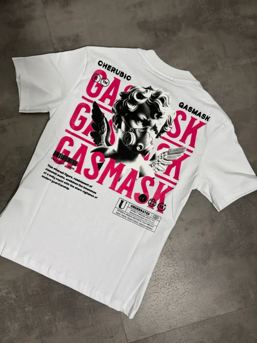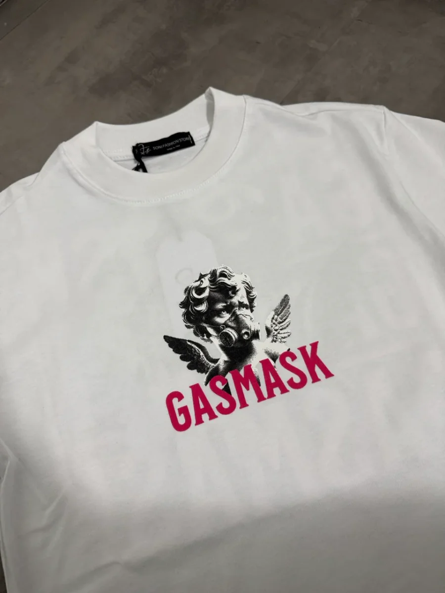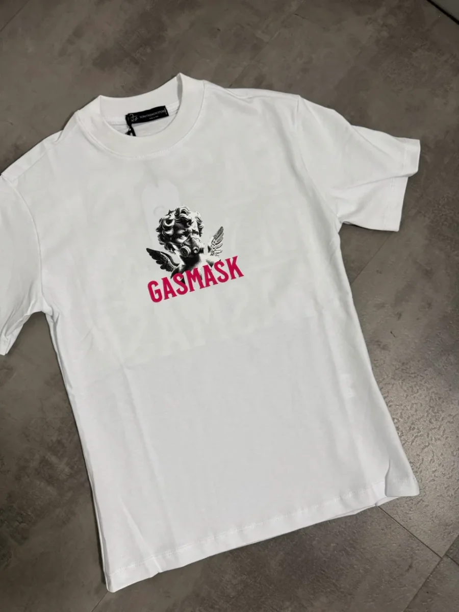 T-shirt bianca a manica corta con stampa frontale “GASMASK” e grafica angelo con maschera antigas. Design urban dal forte impatto visivo, ideale per look street.