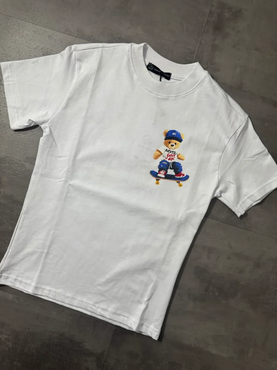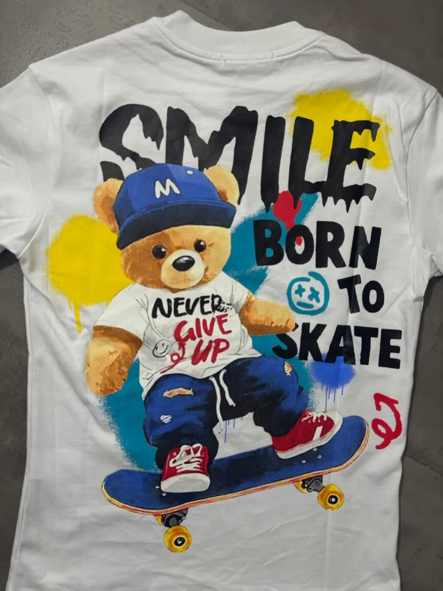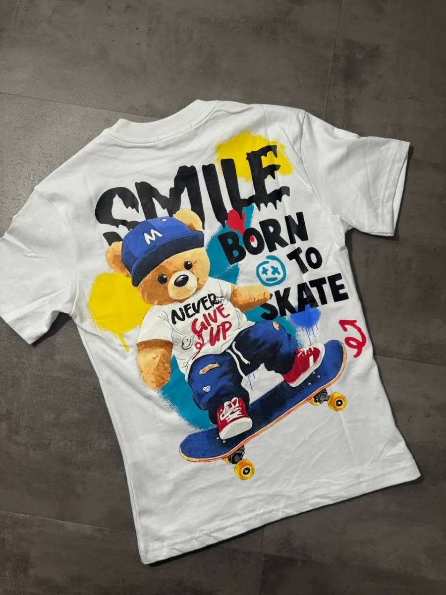 T-shirt bianca a manica corta con stampa frontale orso su skateboard e maxi grafica sul retro con scritte colorate e dettagli effetto spray. Modello dal taglio ampio, pensato per uno stile street dinamico e deciso.