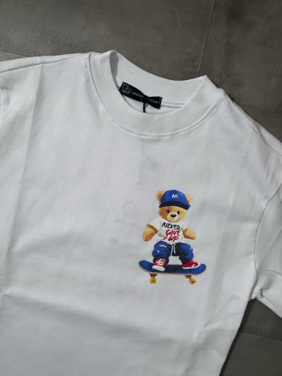 T-shirt bianca con stampa orso skateboard multicolor – OVERSIZE 10-16 anni