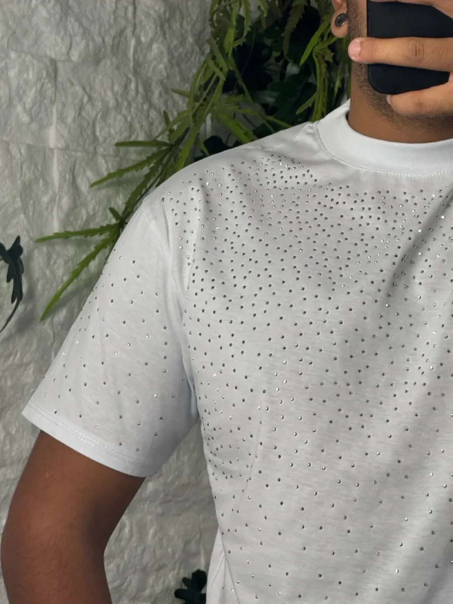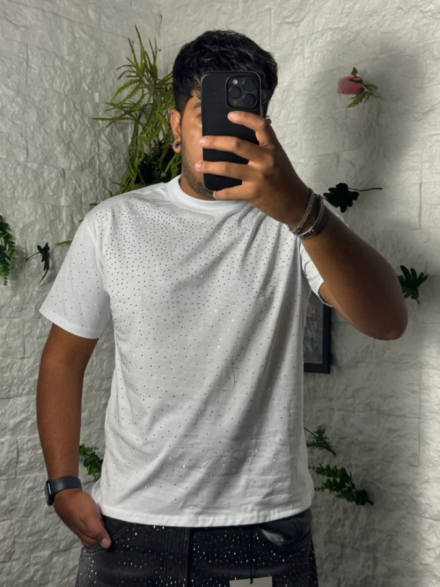 T-shirt in tinta unita con mezzo collo alto e manica corta, impreziosita da applicazioni di micro brillantini distribuiti su tutta la superficie. Il tessuto รจ morbido e leggero, con una struttura pulita che unisce semplicitร e dettaglio luminoso per un uso quotidiano.