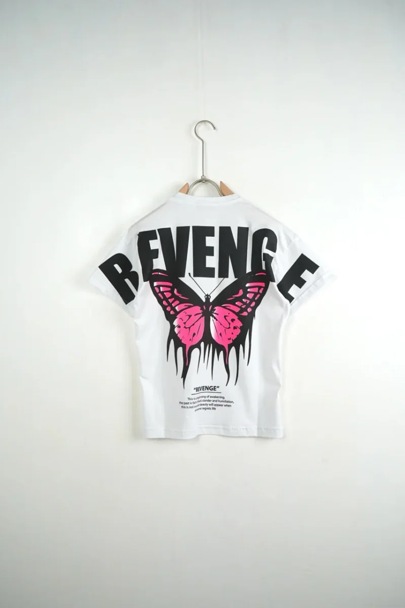 T-shirt bianca in tinta unita con mezzo collo alto e maxi stampa posteriore “REVENGE” con farfalla grafica e dettagli effetto colatura. Modello a manica corta dal design dโimpatto e stile street.