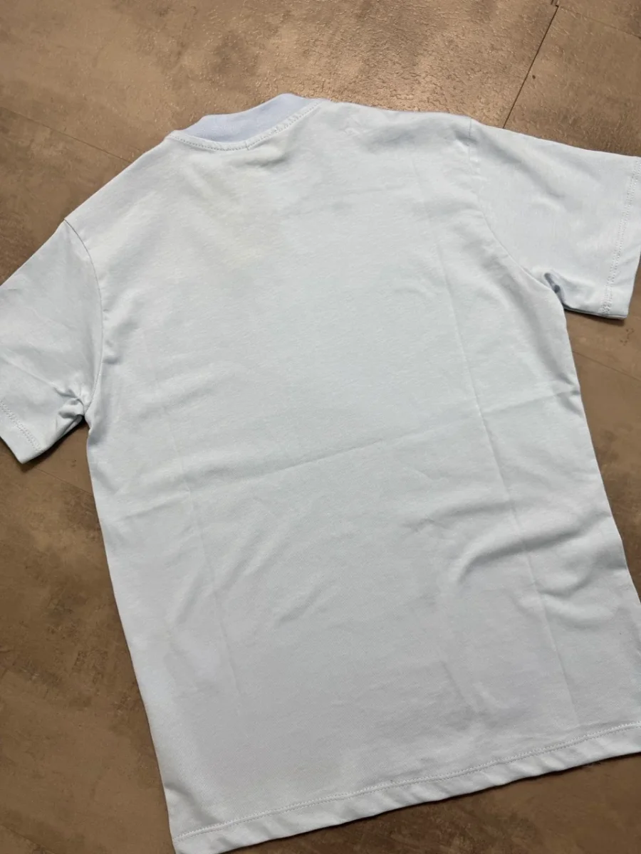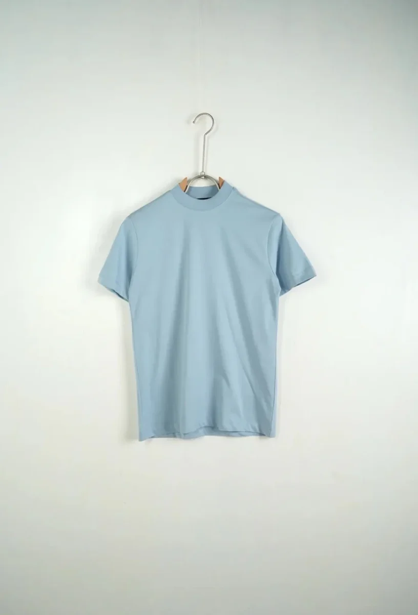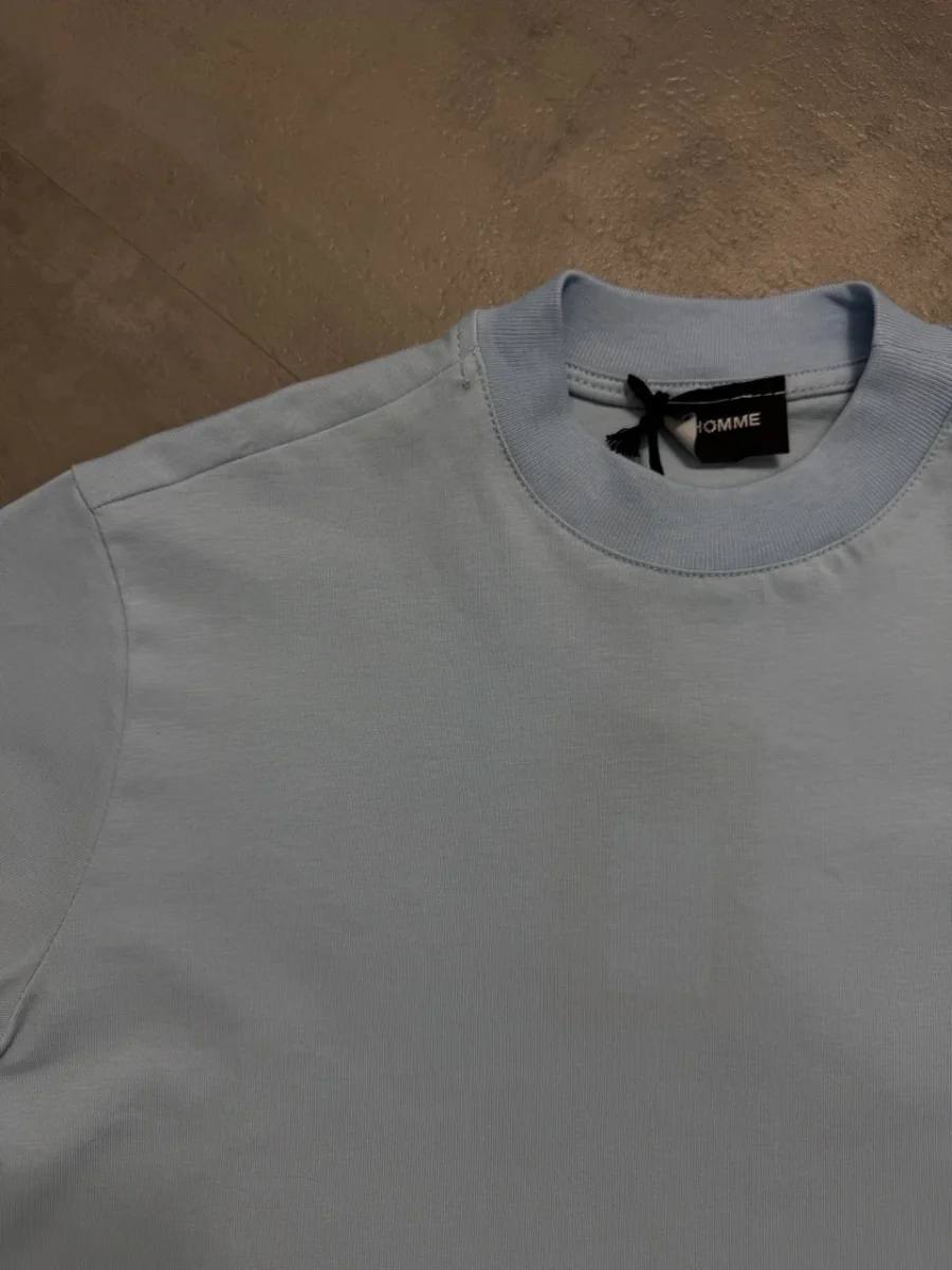 T-shirt celeste a manica corta in tinta unita con mezzo collo alto. Modello essenziale e versatile, perfetto per look quotidiani puliti e moderni.