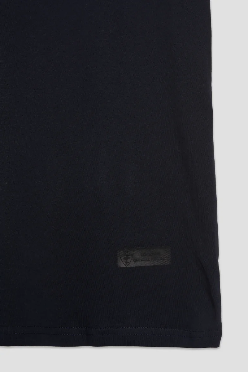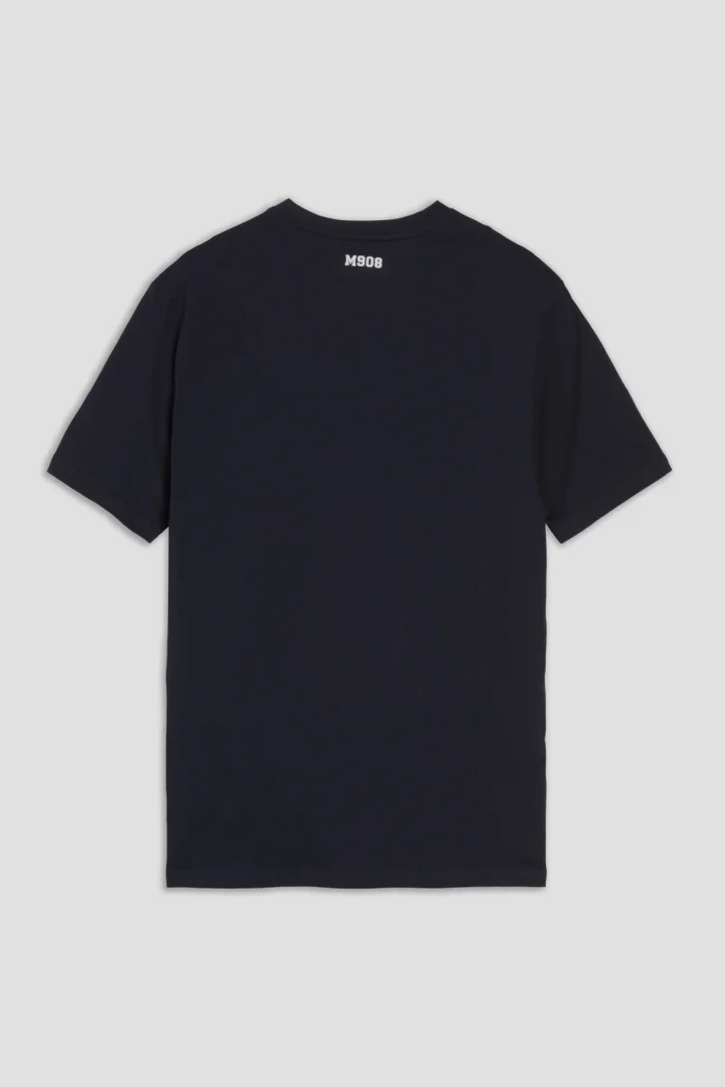 T-shirt in cotone blu navy con stampa a contrasto in stile college, dettaglio sul retro del collo e marchio di autenticitร sul fondo