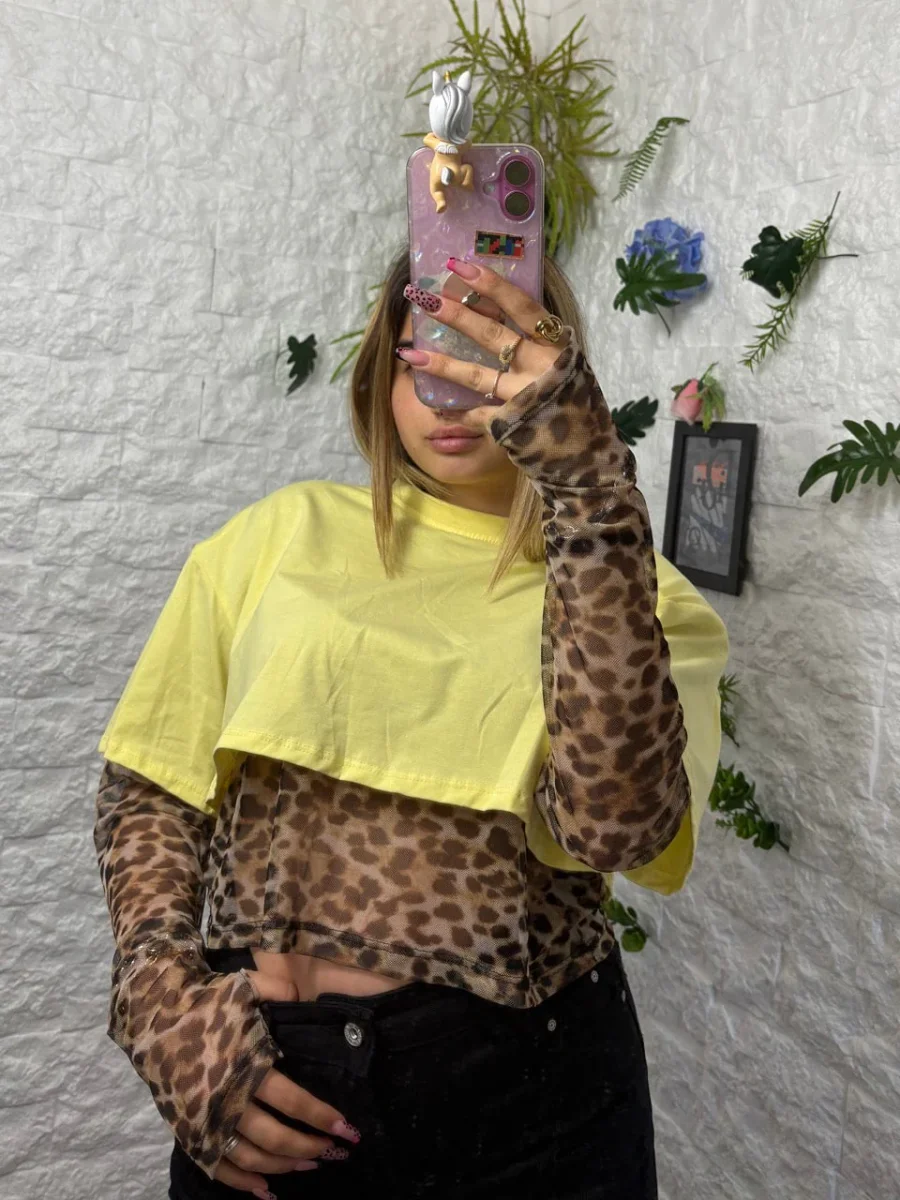 T-shirt crop in cotone con top in tulle leopardato – OVERSIZE Veste da una XS ad una L Taglia unica Vestibilitร Oversize