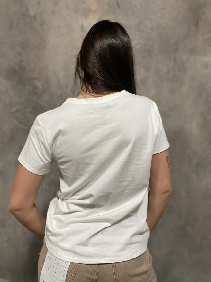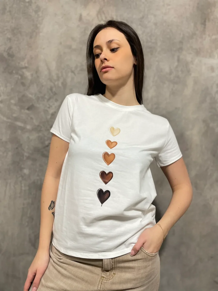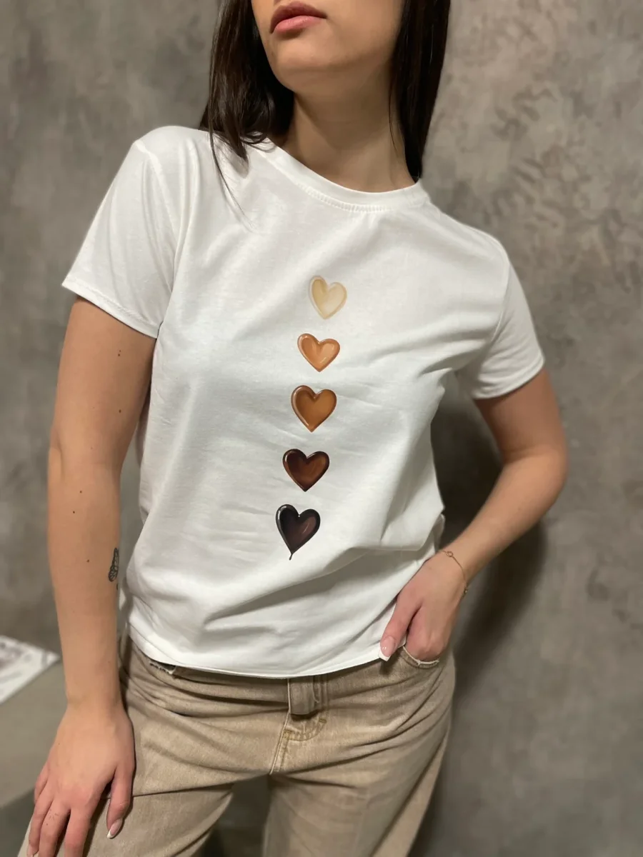 T-shirt con stampa frontale cuori, modello girocollo. Taglia Unica. Composizione: 100% Cotone.