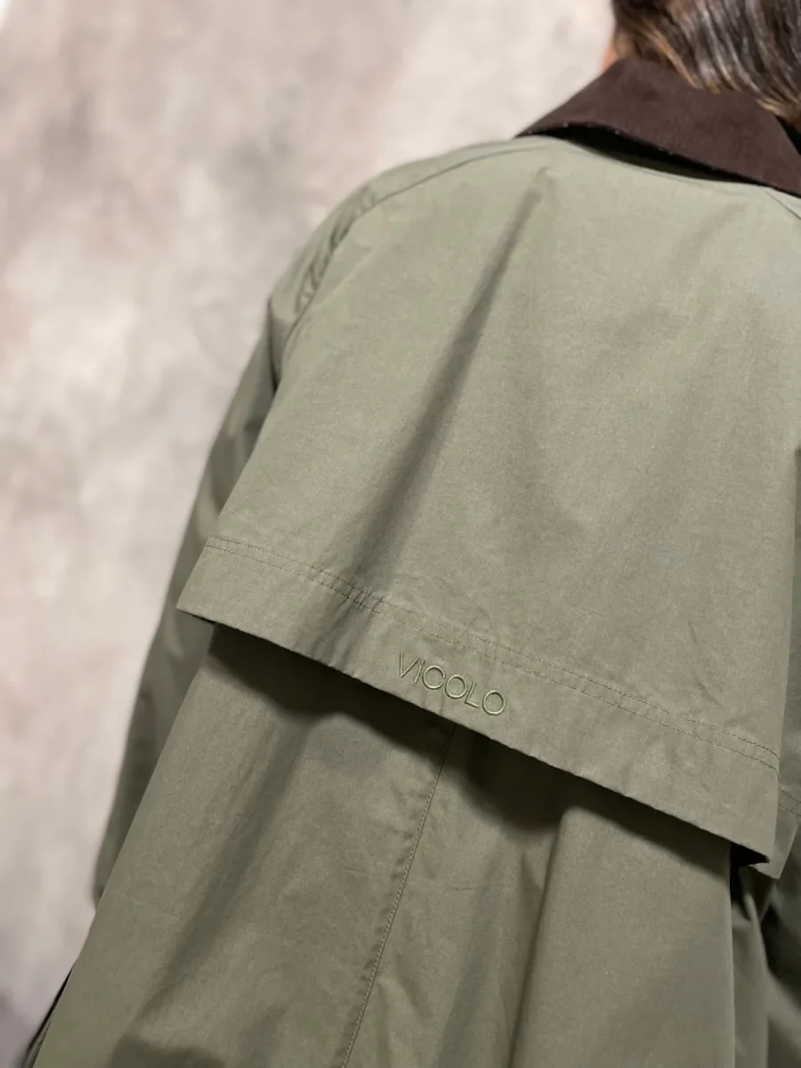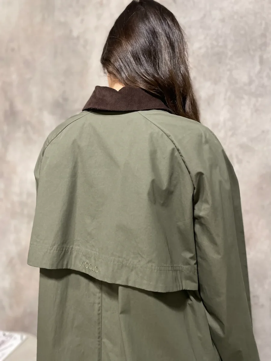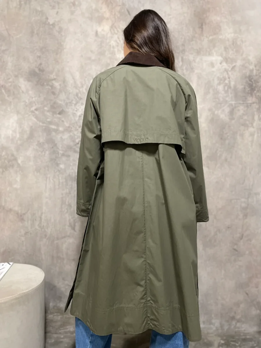Trench lungo verde impermeabile con colletto moro millerighe, chiusura con bottoni oro. Ricamo tono su tono sul retro.