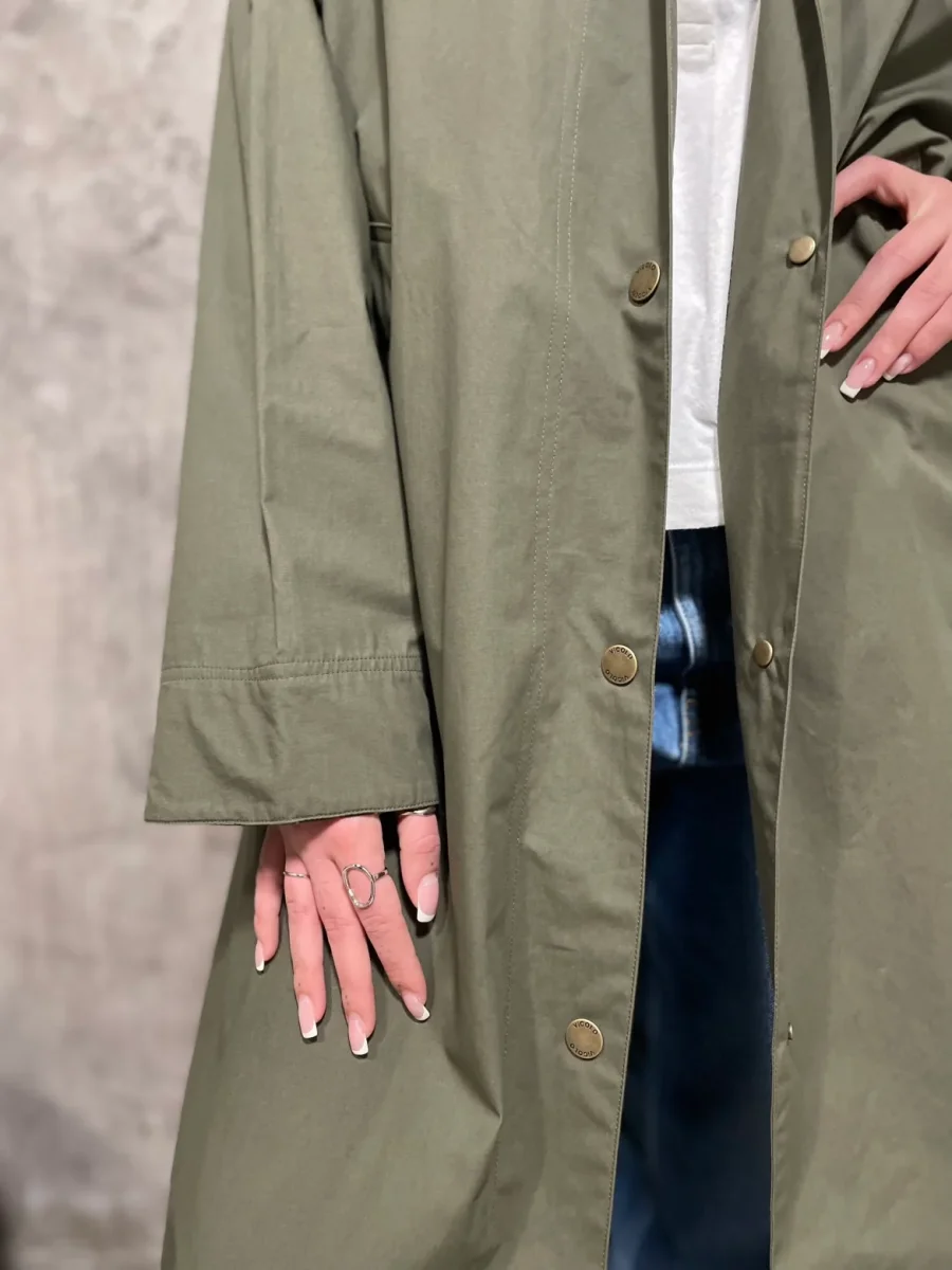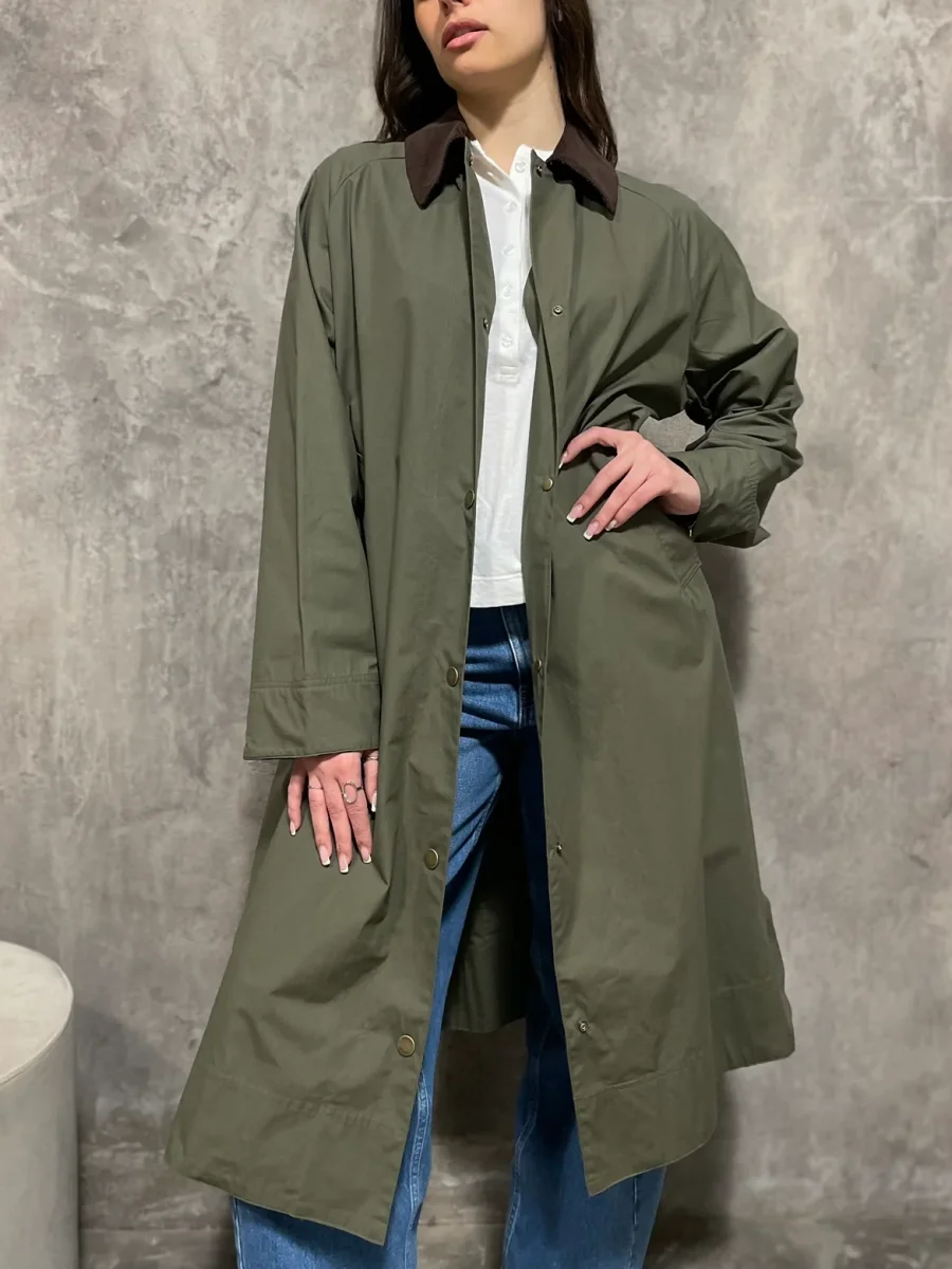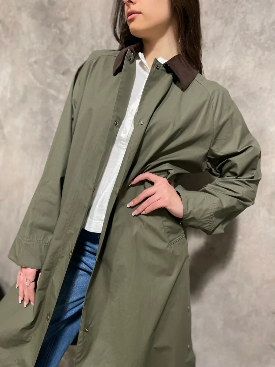 Trench lungo verde impermeabile con colletto moro millerighe, chiusura con bottoni oro. Ricamo tono su tono sul retro.